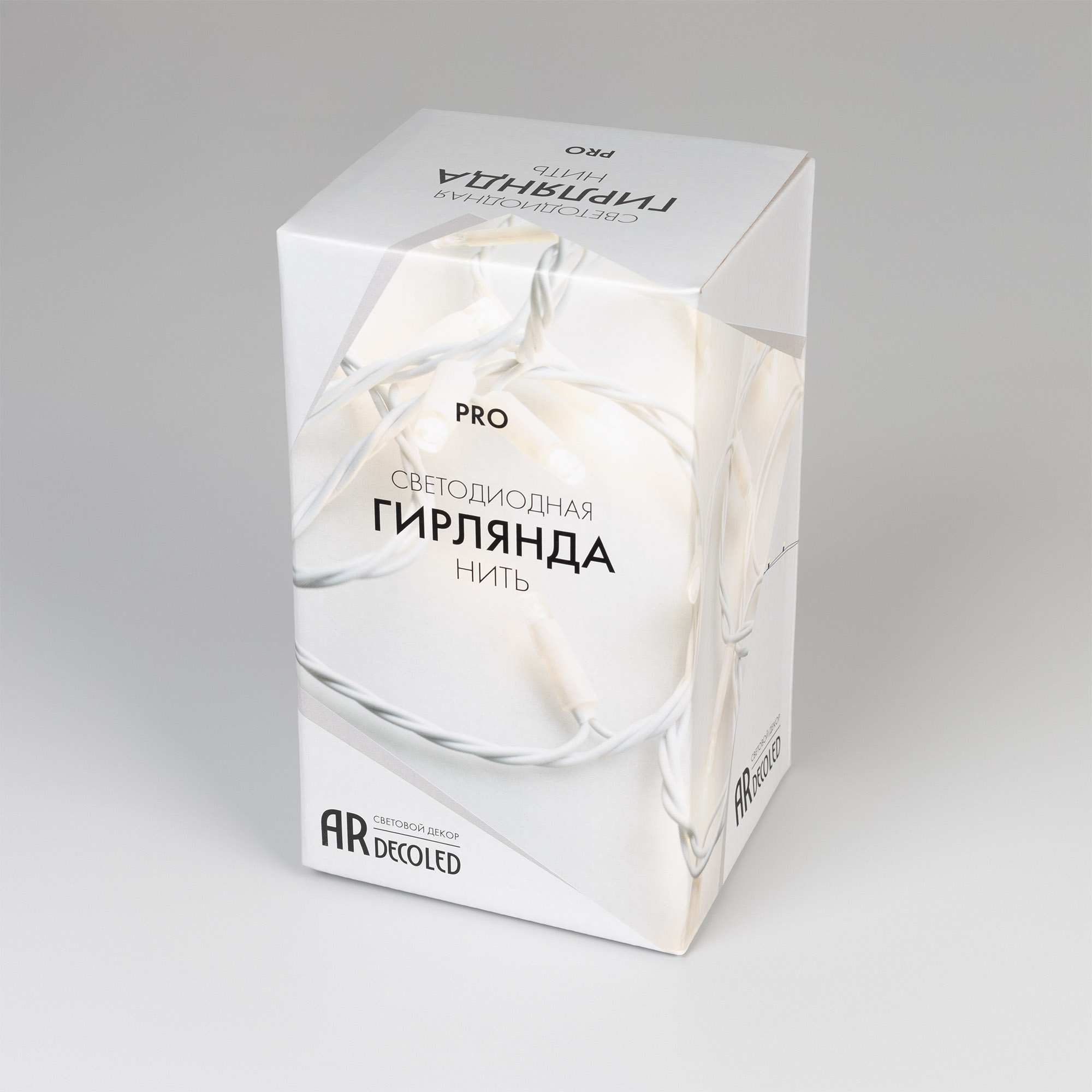 Универсальная светодиодная гирлянда "НИТЬ" серии Pro, предназначенная для декорирования и создания праздничного настроения как внутри помещений, так и снаружи (степень пылевлагозащиты IP65 позволяет размещать гирлянду на улице под навесом). Имея длину 10000 мм, она может использоваться для оформления средних и больших площадей. Универсальные соединительные разъемы позволяют наращивать длину до 50 м без использования дополнительных аксессуаров. Прозрачная вогнутая линза и эффект мерцания редких точек обеспечивают яркое и динамичное освещение, выделяя украшаемые объекты. Белый свет помогает создать необходимую атмосферу для декоративного объекта. Провод изготовлен из каучука и окрашен в чёрный цвет. Аксессуары для подключения и управления приобретаются отдельно.