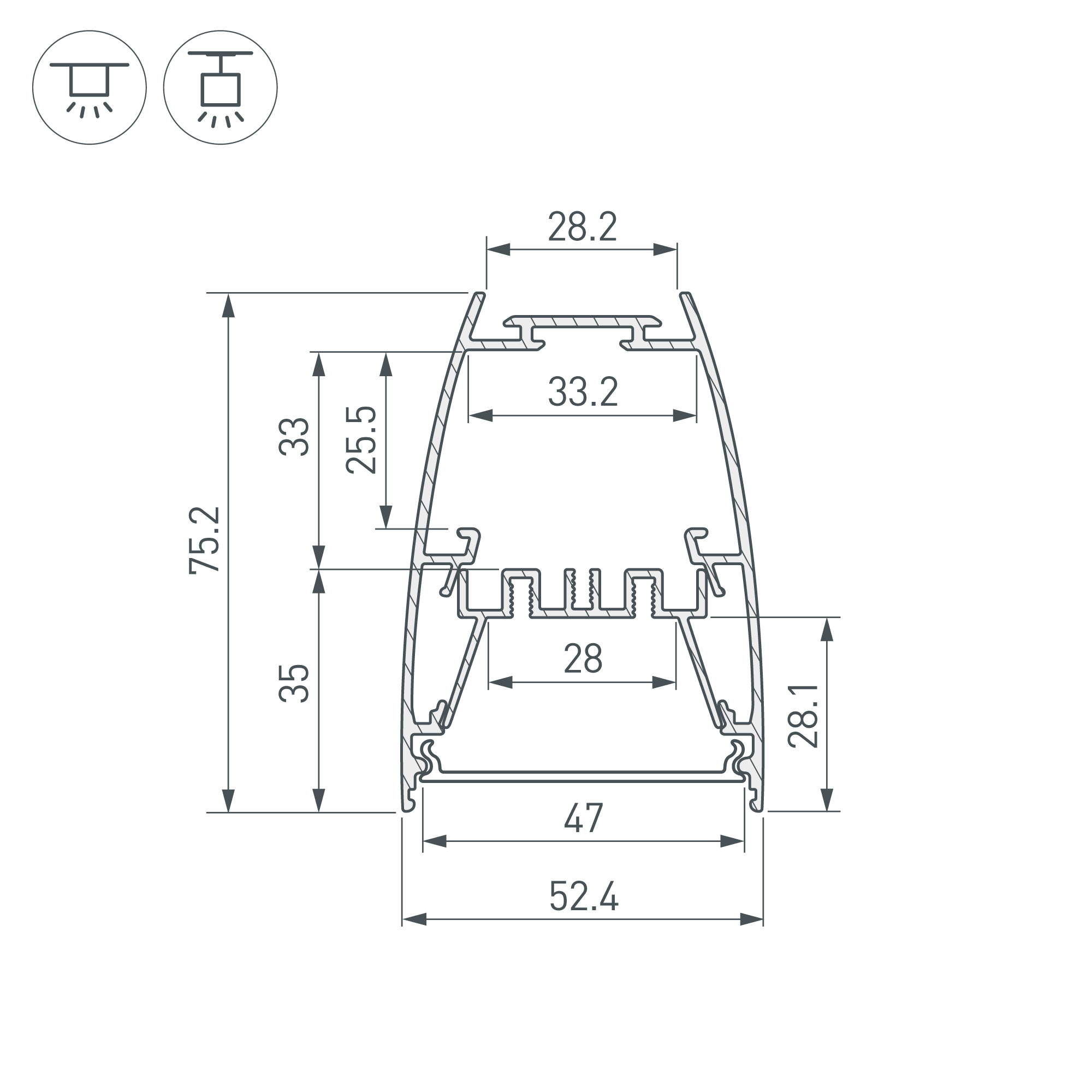 Отсек для блока питания (33,2х25,5 мм) и съемная площадка для светодиодной ленты значительно облегчают сервисное обслуживание осветительного оборудования. Габаритные размеры профиля составляют 2000 мм в длину, 75,2 мм в ширину и 52,4 мм в высоту. Площадки для установки светодиодных лент позволяют использовать ленты шириной до 28 мм и мощностью до 46 Вт/м. Это обеспечивает гибкость в выборе светодиодных лент и создает потрясающие световые решения.