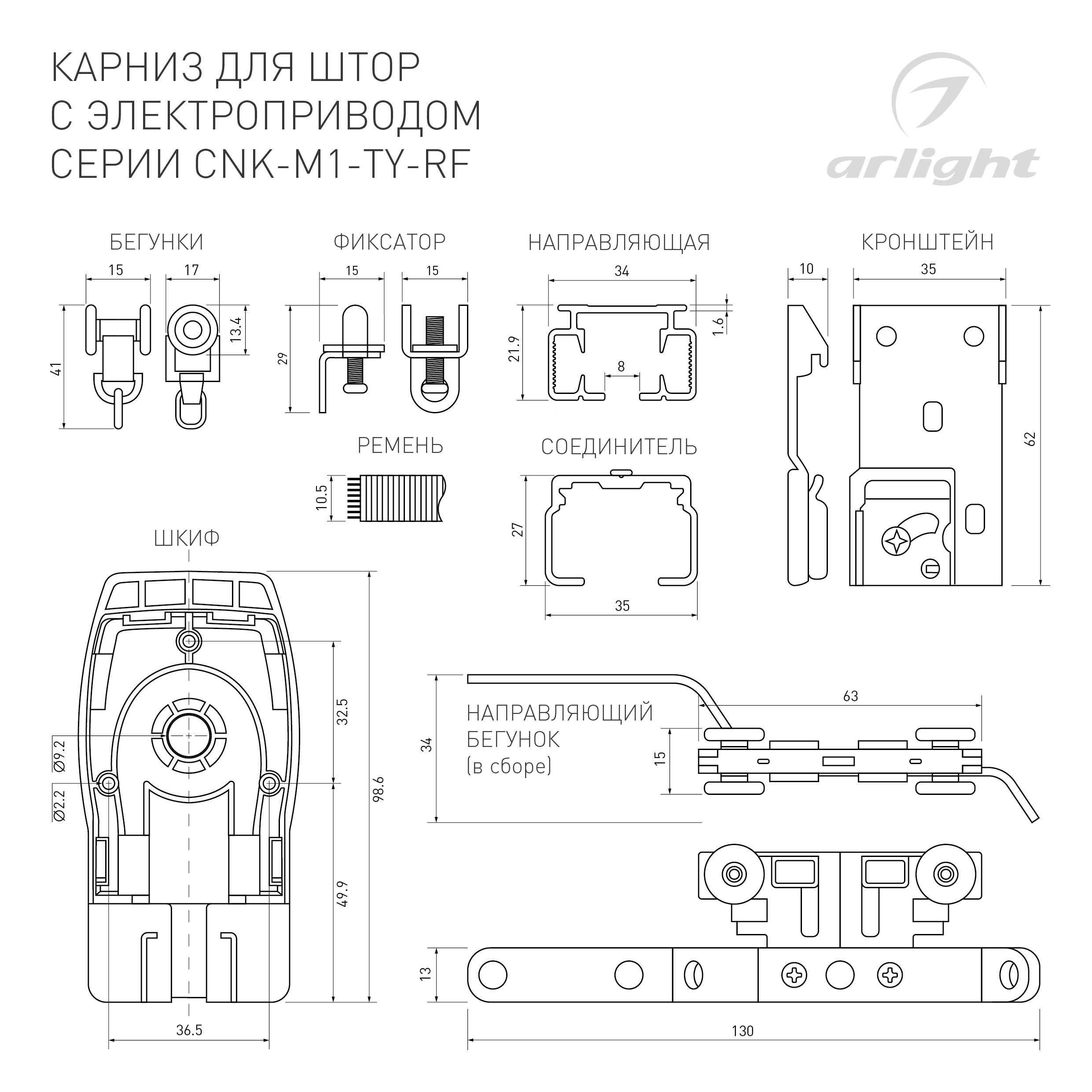 Комплект электрокарниза длиной до 4м (регулируется наборными частями) для раздвижных штор, состоящий из мотора, наборного алюминиевого трека, пульта и комплектующих. Электропривод с питанием 100-240В, мощность 45Вт, момент 1.2Нм, вес штор до 40кг. Управление с помощью пульта из комплекта, по WI-FI, 2.4ГГц, Bluetooth, "сухими" контактами на входе RJ45. Совместим с платформой TUYA, АЛИСА от ЯНДЕКС. Управление со смартфона через приложение SmartLife, с помощью пульта в комплекте. Ремень из комплекта находится на дне коробки. 1 мотор, 1 пульт дистанционного управления, алюминиевый профиль 1,6 мм (1м - 3шт, 0.5м - 1шт, 0.2м - 2шт., 0.1м - 1 шт.), 3 соединителя 10 см, 1 соединитель 20 см, 1 переходник 5 см, 2 шкива, 2 пряжки ремня, 2 направляющих бегунка, ремень 8,4 м, 24 бегунка, 2 фиксатора, 8 кронштейнов, 1 зажим на ремень