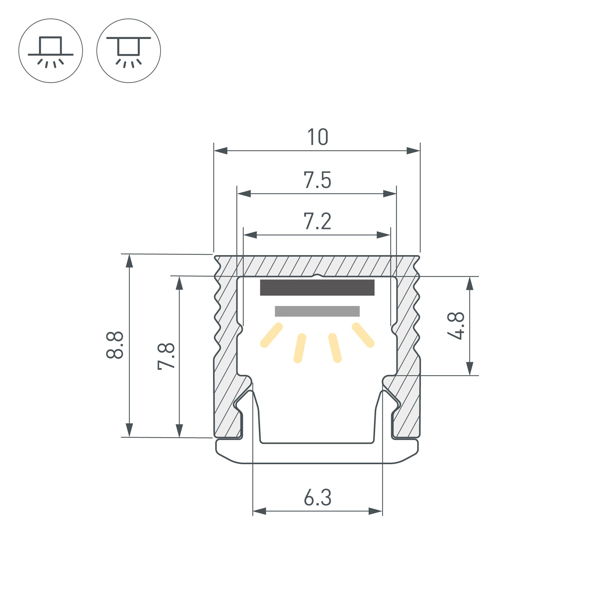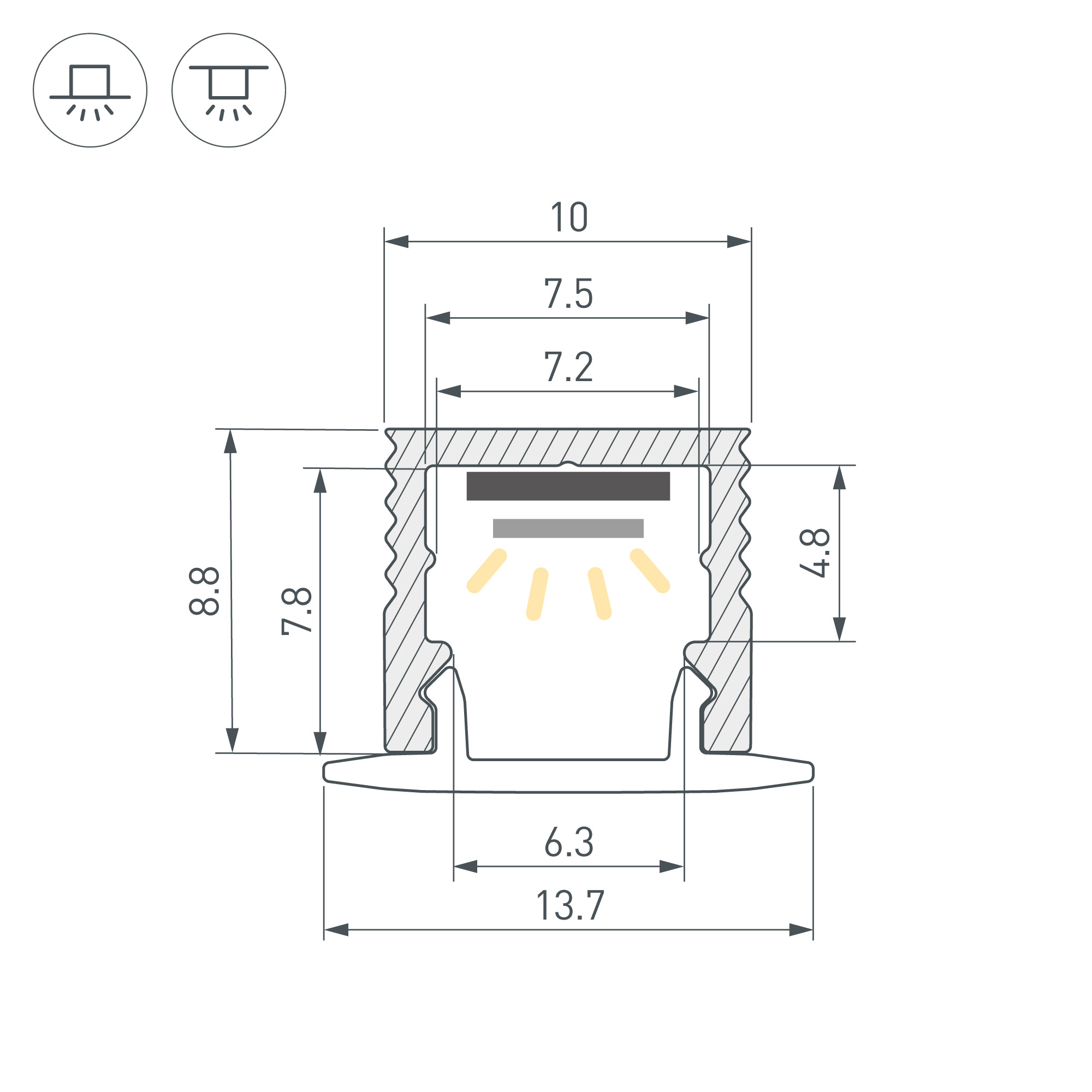 Накладной/встраиваемый микро-профиль из анодированного алюминия для подсветки мебели, пазов, ниш и других элементов интерьера. В зависимости от выбранного экрана профиль можно как установить на поверхность, так и встроить в неё. Габаритные размеры профиля составляют 2000 мм в длину, 10 мм в ширину и 8,8 мм в высоту. Площадка для установки светодиодных лент позволяет использовать ленту шириной до 7,5 мм и мощностью до 10 Вт/м. Это обеспечивает гибкость в выборе светодиодных лент и создает потрясающие световые решения.