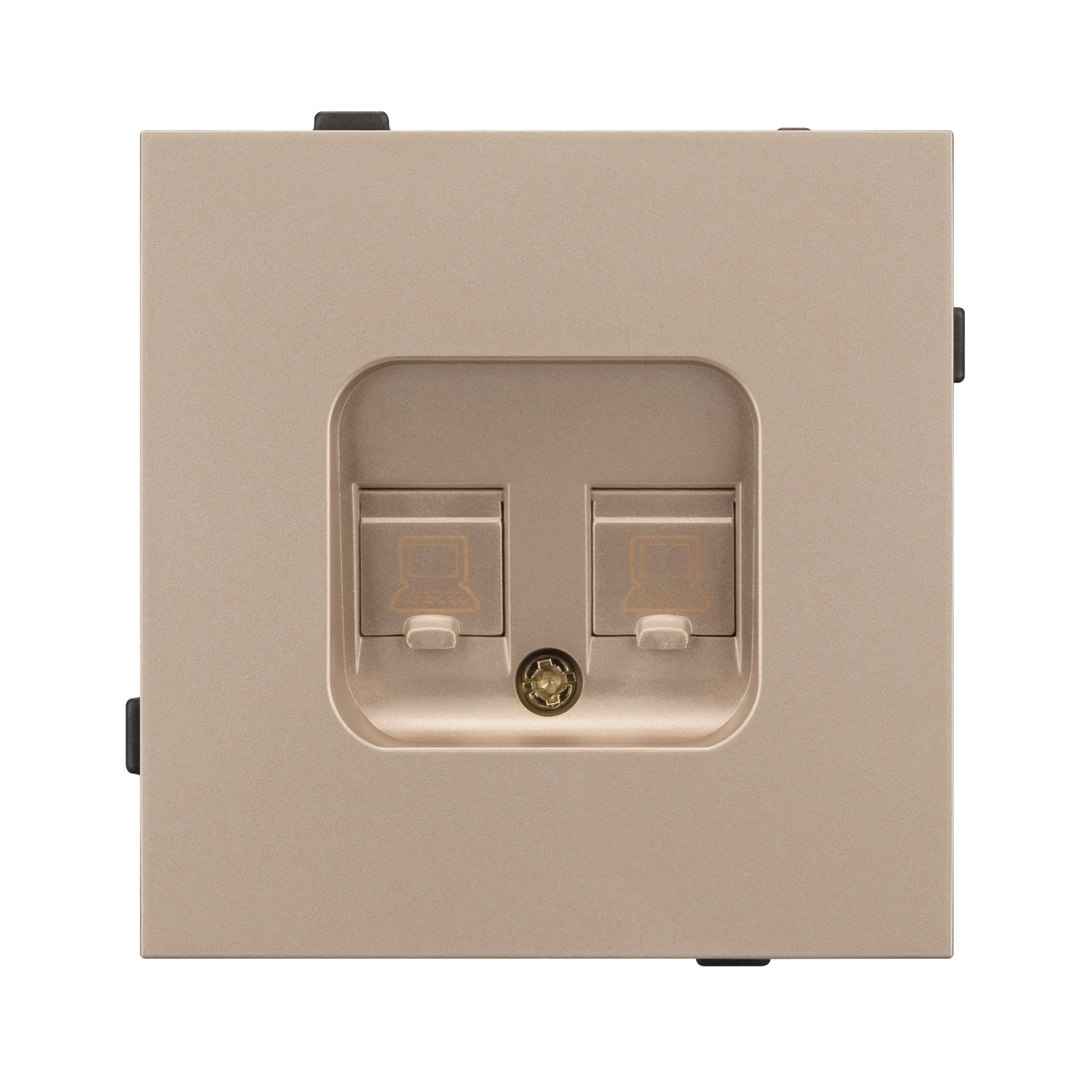 Механизм компьютерной розетки совместим с рамками серии TENDO, создает утонченный минималистичный вид. Скрытый тип монтажа позволяет гармонично встроить в интерьер любого современного дизайн-проекта. Видимая часть механизма выполнена из высококачественного пластика золотого цвета и имеет матовое покрытие.