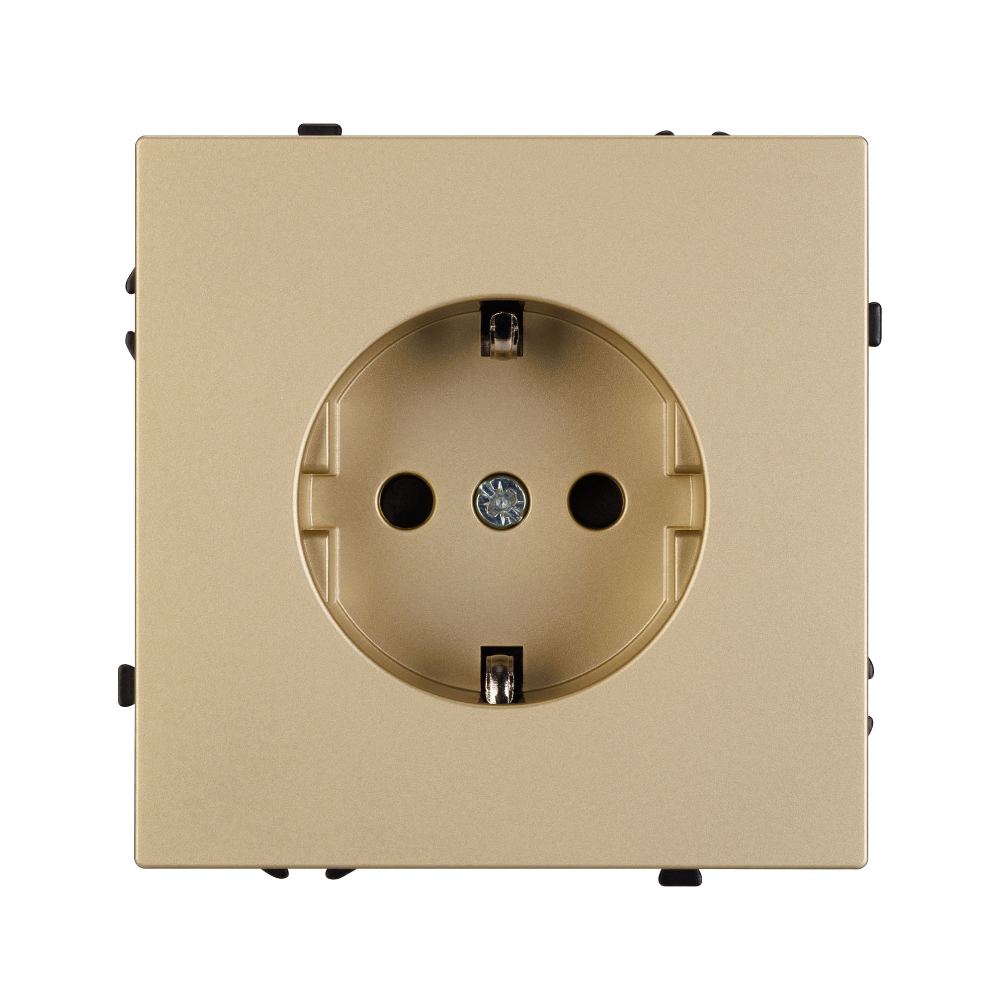 Механизм розетки с заземлением на 1 пост. Цвет - золотой, с Soft-Touch покрытием. Без фронтальной рамки. Уровень пылевлагозащиты IP20. Розетка устанавливается в стандартный подрозетник круглого сечения диаметром 60мм. Габаритные размеры: длина 71 мм, ширина 71 мм, высота 44 мм. Гарантийный срок 10 лет.
