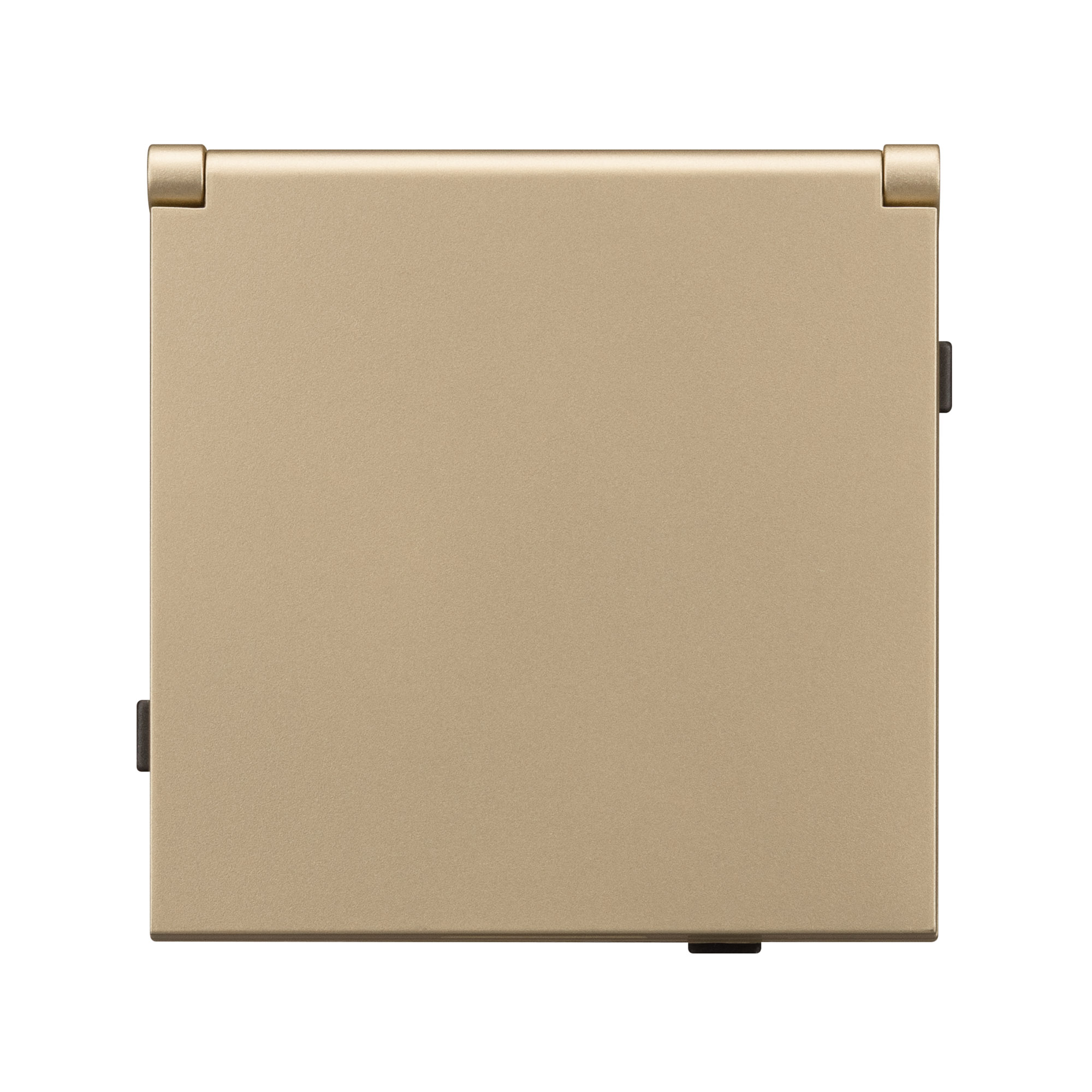 Механизм розетки с заземлением и влагозащитной крышкой на 1 пост. Цвет - золотой, с Soft-Touch покрытием. Без фронтальной рамки. Уровень пылевлагозащиты IP44. Розетка устанавливается в стандартный подрозетник круглого сечения диаметром 60мм.