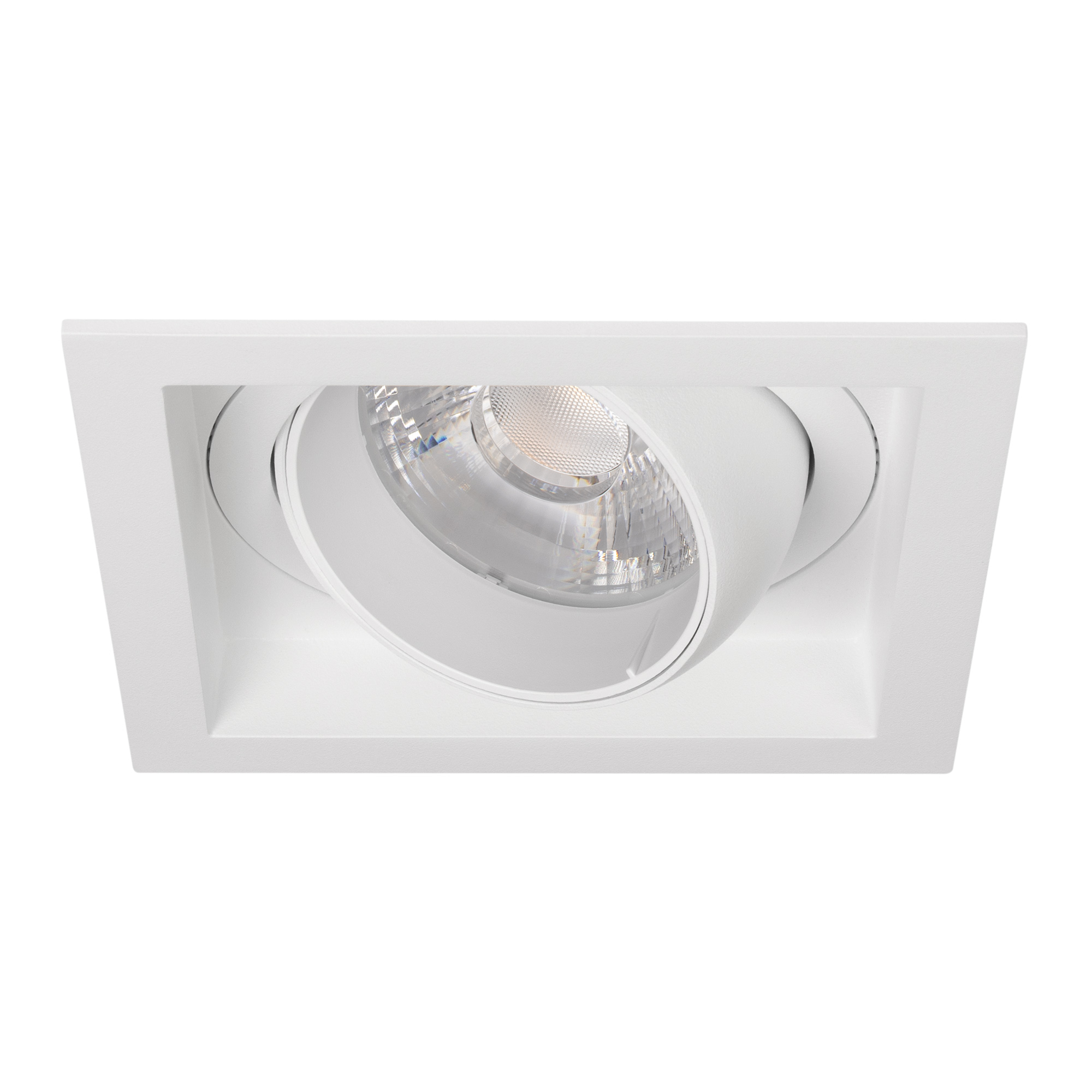 Встраиваемый карданный светильник. Мощность 30 Вт, св. поток 3104 лм, 102лм/Вт, дневной 4000 K, CRI>92, угол 17°, напряжение питания 230 В. Белый корпус из алюминия, белая вставка, степень защиты IP20. Размер: длина 140 мм, ширина 140 мм, высота 125 мм. Монтаж встраиваемый, установочное отверстие: длина 120 мм, ширина 120 мм. Драйвер 24-42 В, 750 мА, пульсация <2%.