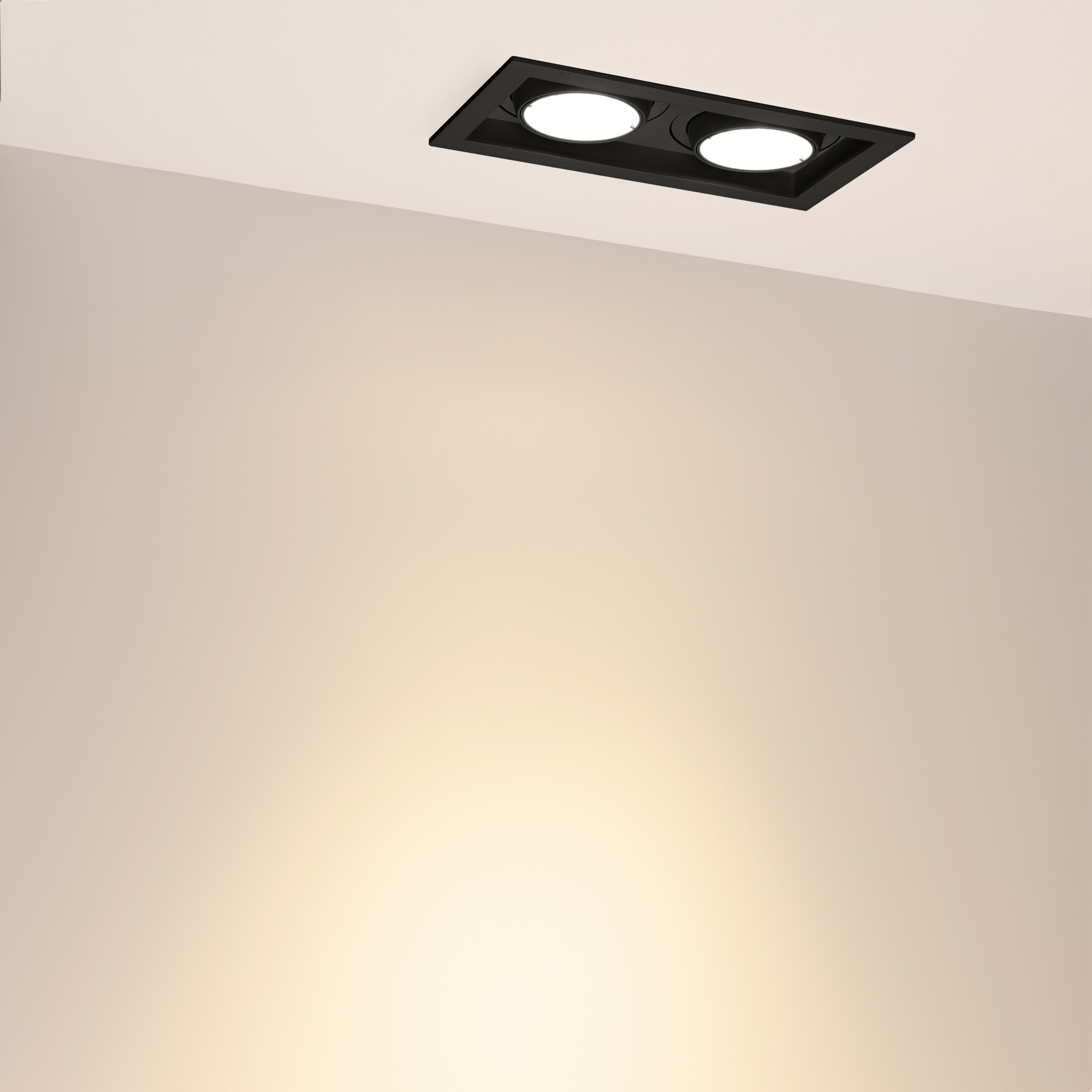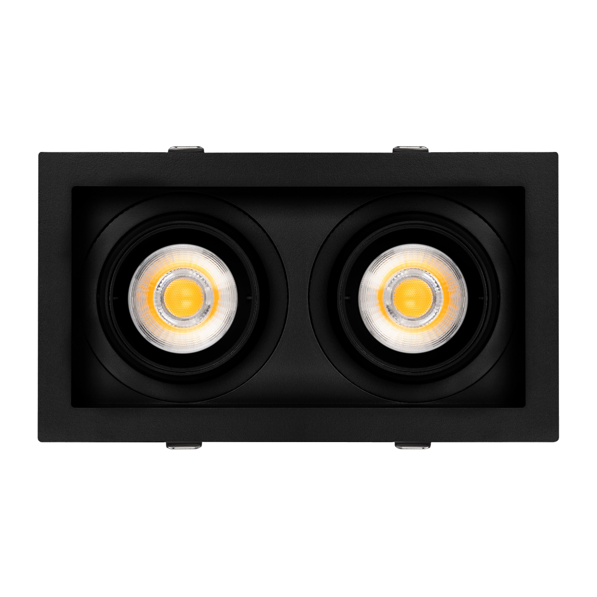 Поставка под заказ от 30 шт. Встраиваемый карданный светильник. Мощность 2х20 Вт, св. поток 4264 лм, 103 лм/Вт, тёплый 3000 K, CRI>92, угол 40°, напряжение питания 230 В. Чёрный корпус из алюминия, белая вставка, степень защиты IP20. Размер: длина 210 мм, ширина 117 мм, высота 105 мм. Монтаж встраиваемый, установочное отверстие: длина 190 мм, ширина 95 мм. Драйвер 24-42 В, 500 мА, пульсация <2%.