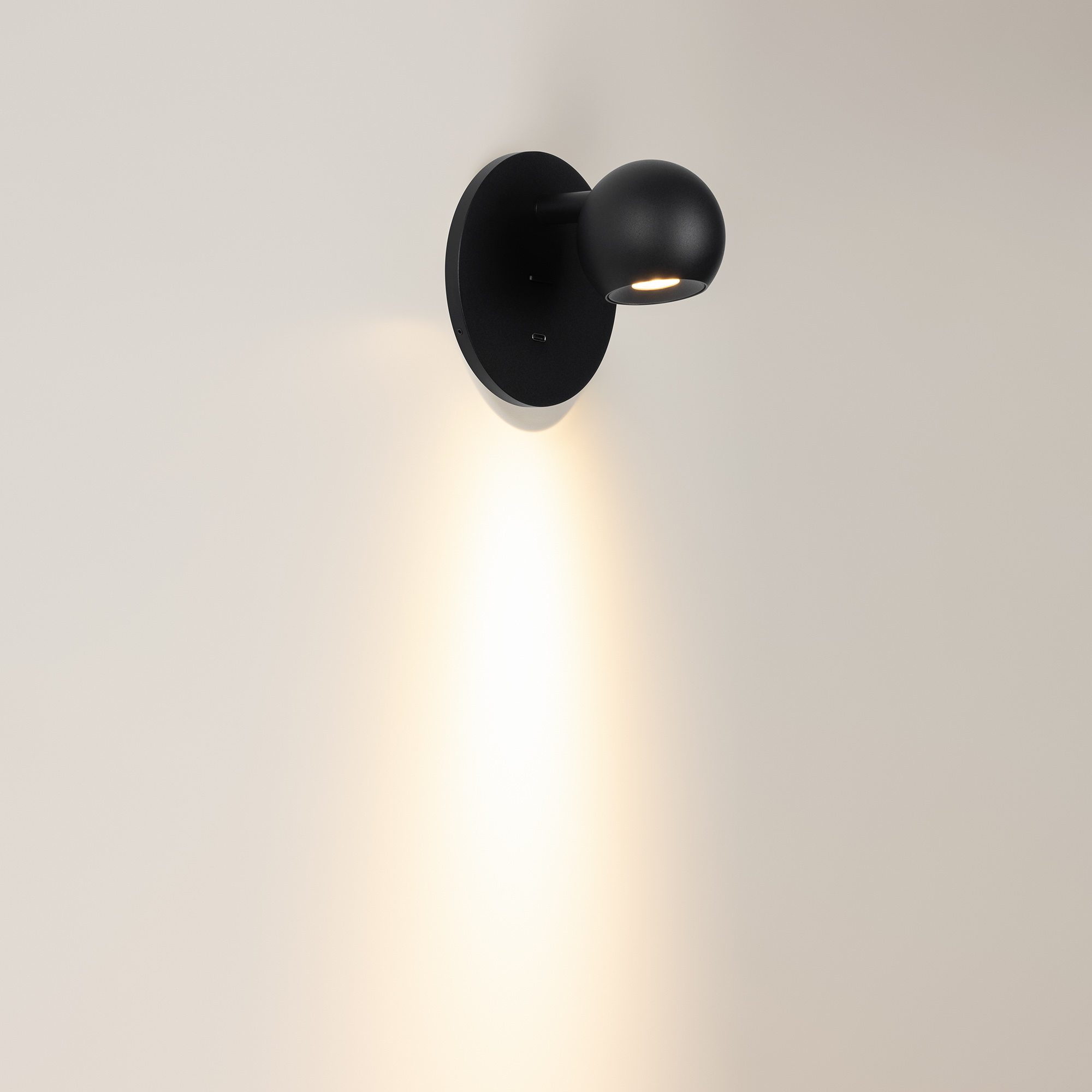 Встраиваемый настенный светильник. Мощность 6 Вт, св. поток 580 лм, 100 лм/Вт, теплый 3000 K, CRI>90, угол 30°, напряжение питания 230 В. Чёрный круглый корпус из алюминия, степень защиты IP20. Габариты: Ø110х103 мм, размер основания Ø110х8 мм, размер светового модуля Ø65×55,5 мм. IP20. Встроенный USB порт для зарядки (TYPE-C). Выключатель на корпусе.