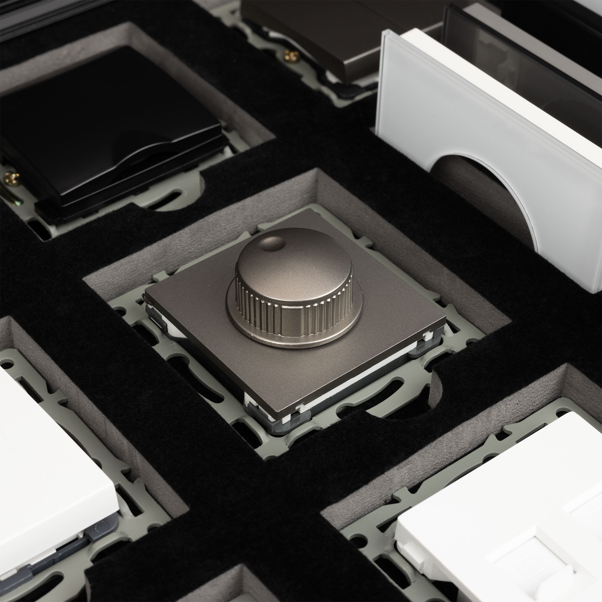 Демо-кейс с наполнением электроустановочных изделий серий VERSA, GLARE, PRESTO и сопутствующих механизмов.