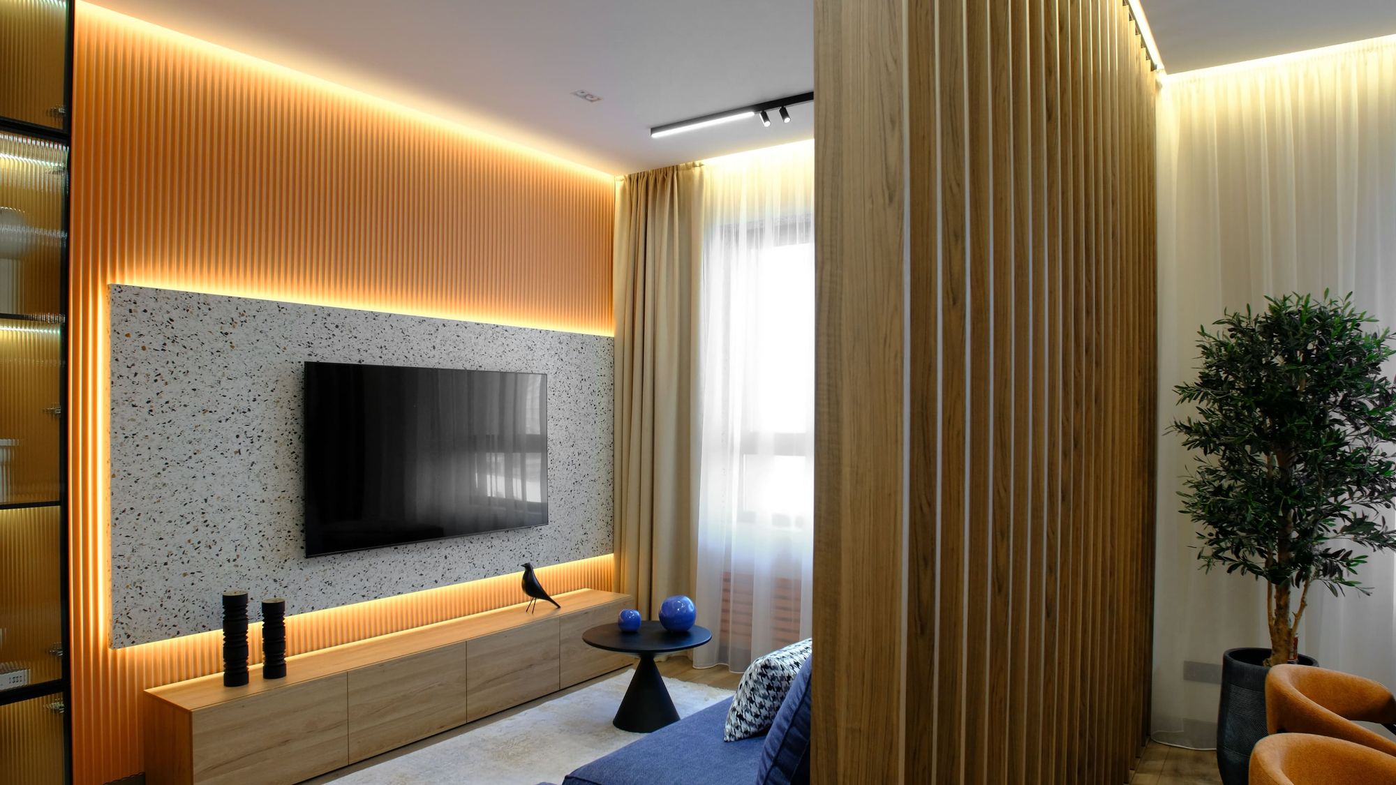 Закарнизная подсветка — один из часто применяемых приемов освещения в проекте. С помощью светодиодной ленты Arlight серии RT был создан эффект «парящего» потолка на кухне, в гостиной и коридоре, а также подсвечена декоративная плита с телевизором на стене из реек. Для создания закарнизной подсветки и эффекта «парящей» ванны в санузле была использована герметичная лента серии RTW с повышенной степенью пылевлагозащиты (IP65).