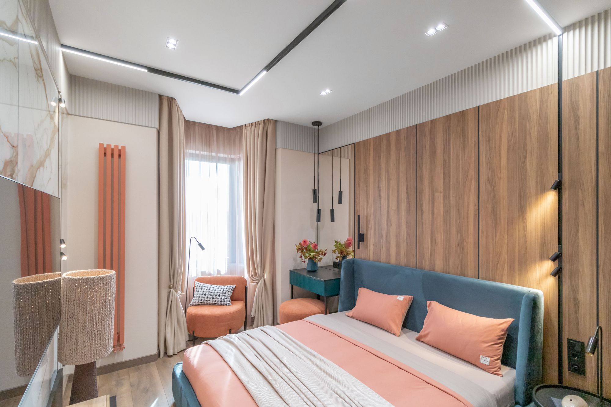 Интерьер компактной квартиры в ЖК «ЗИЛАРТ» построен на сочетании жизнерадостного персикового цвета и элегантных синих оттенков. Благодаря такой контрастной цветовой гамме пространство не перегружено и визуально выглядит шире. В свою очередь, добиться ощущения объема и воздушности помогло грамотное зонирование с помощью различных видов источников света.