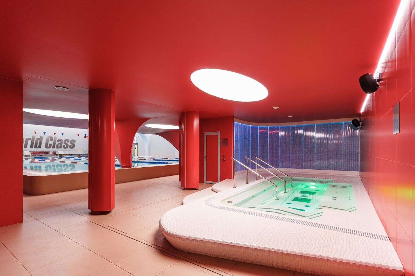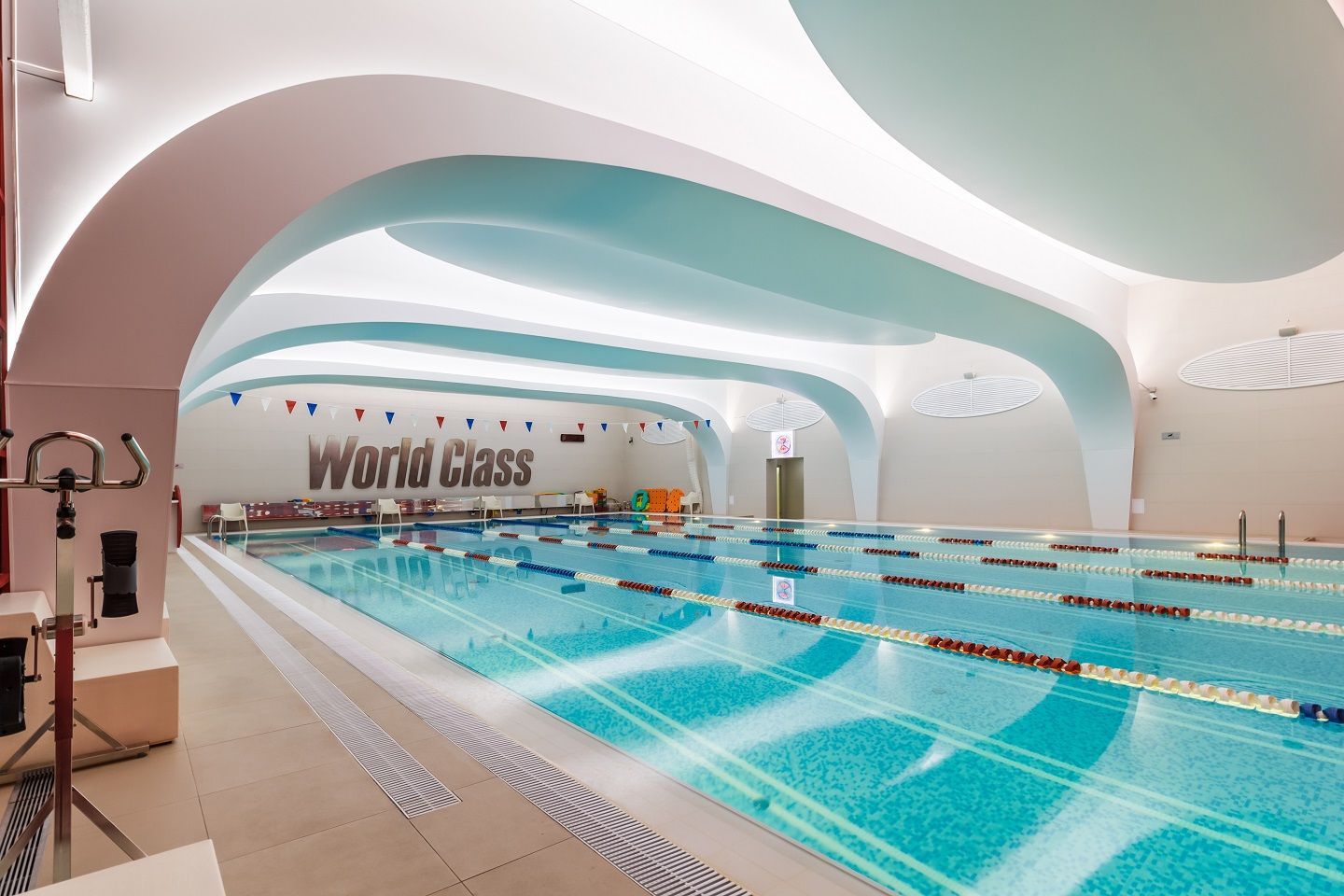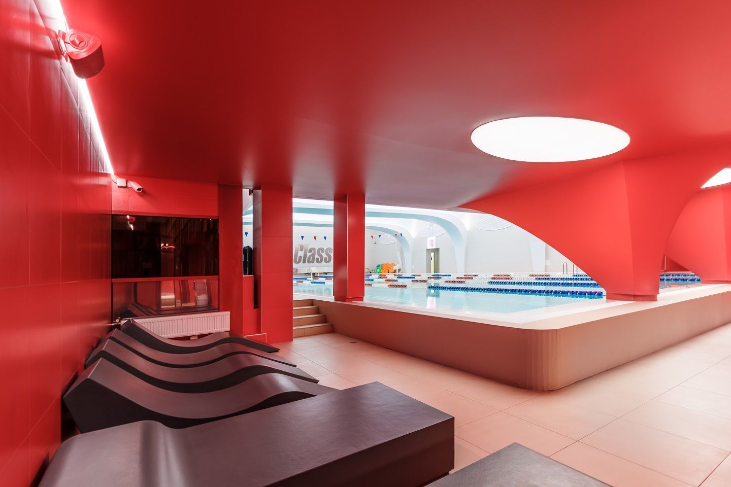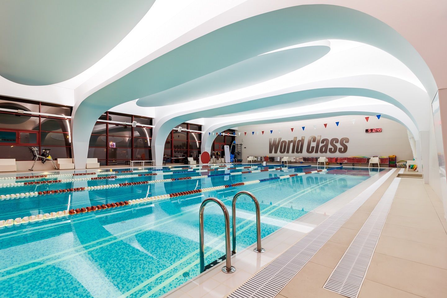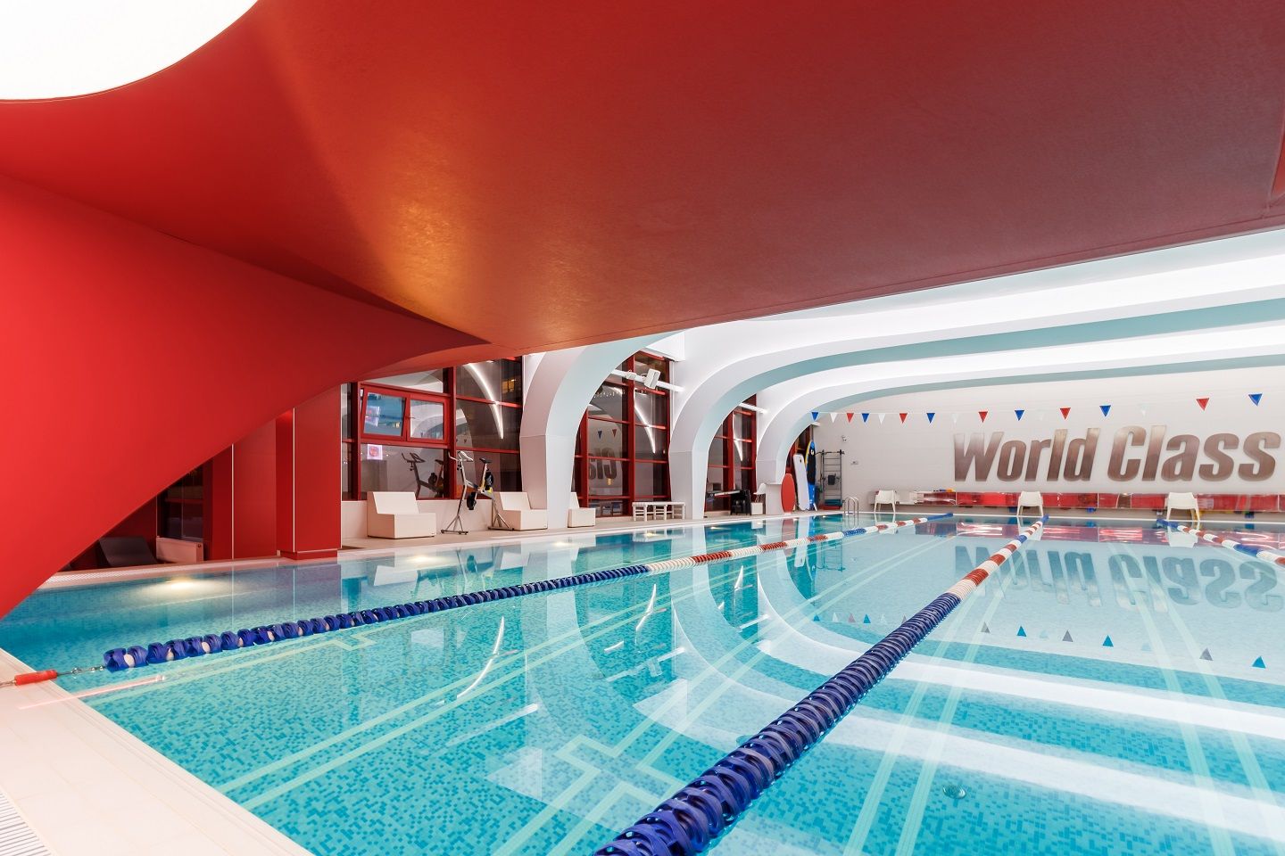 В аква-зоне использованы герметичные светодиодные ленты, которые создают контурную подсветку и подчеркивают форму бассейна. Для разноцветной подсветки ступеней, лестниц, бортиков и других элементов также выбраны герметичные светодиодные ленты, устойчивые к воздействию воды и хлора. Целью проекта освещения было создание уникальной атмосферы и запоминающегося облика фитнес-клуба премиум-класса.