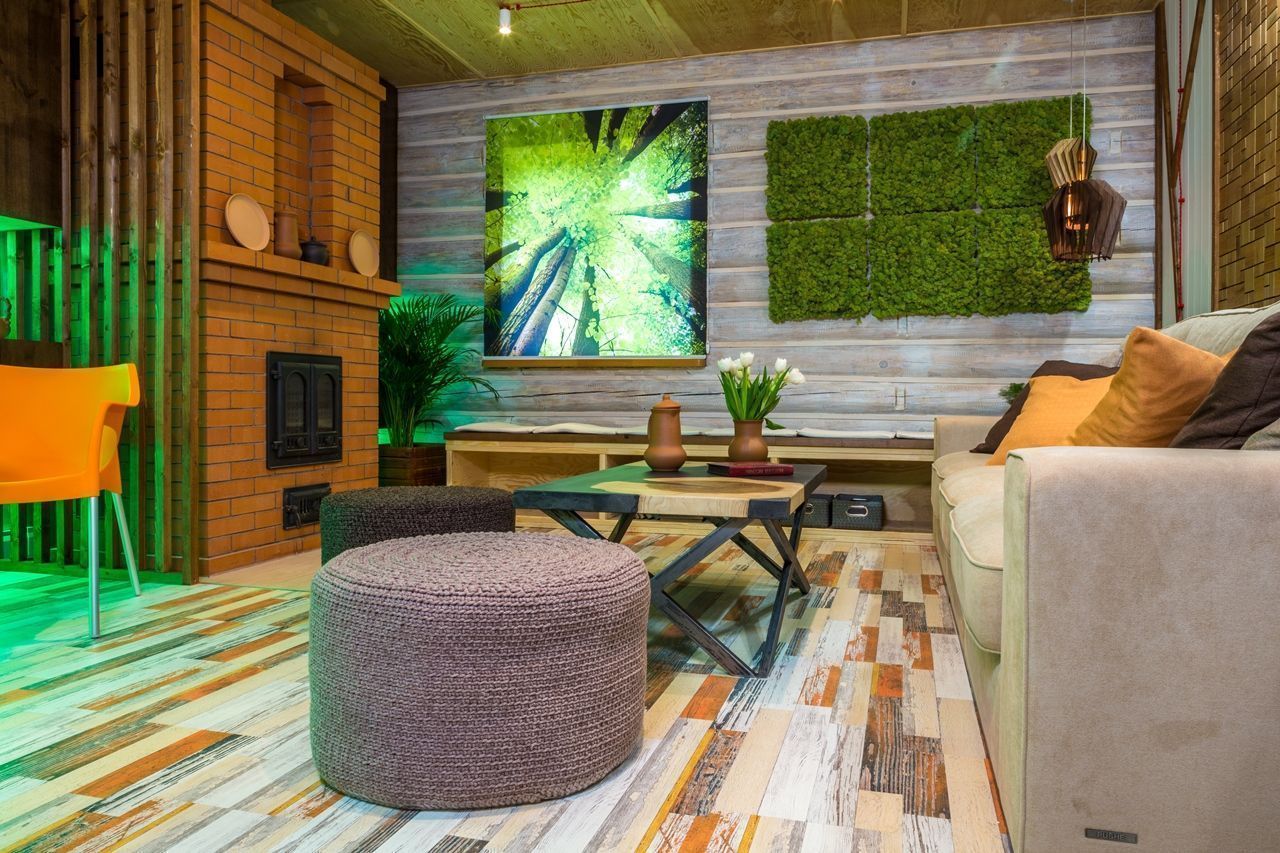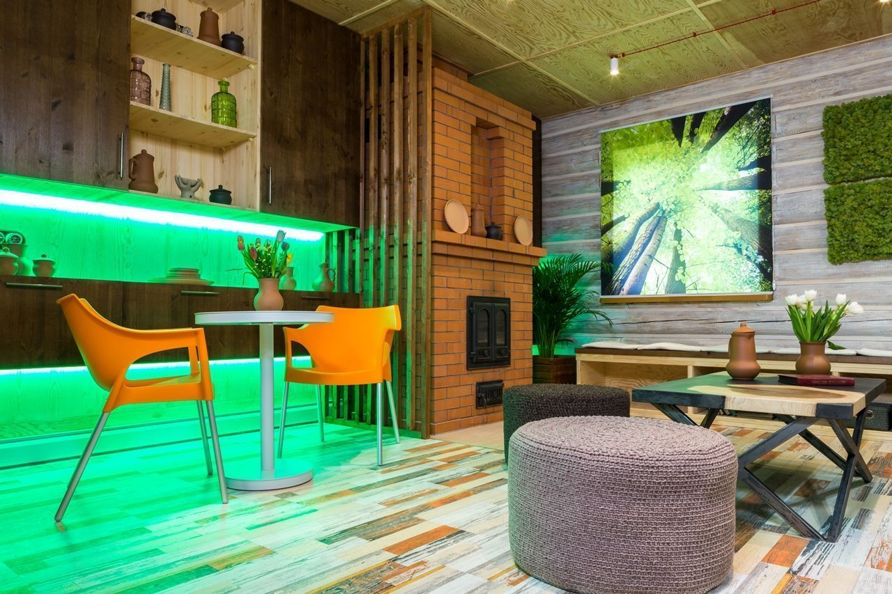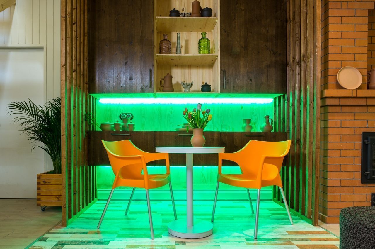 Экологичный интерьер нельзя представить без зелени – цветов и растений. Они являются неотъемлемым атрибутом нового интерьера. А дополнением к ним стала светодиодная подсветка, подчеркнувшая «зелёный» стиль гостиной. Для этого светодиодная лента Arlight зелёного цвета свечения была установлена под навесными шкафами.