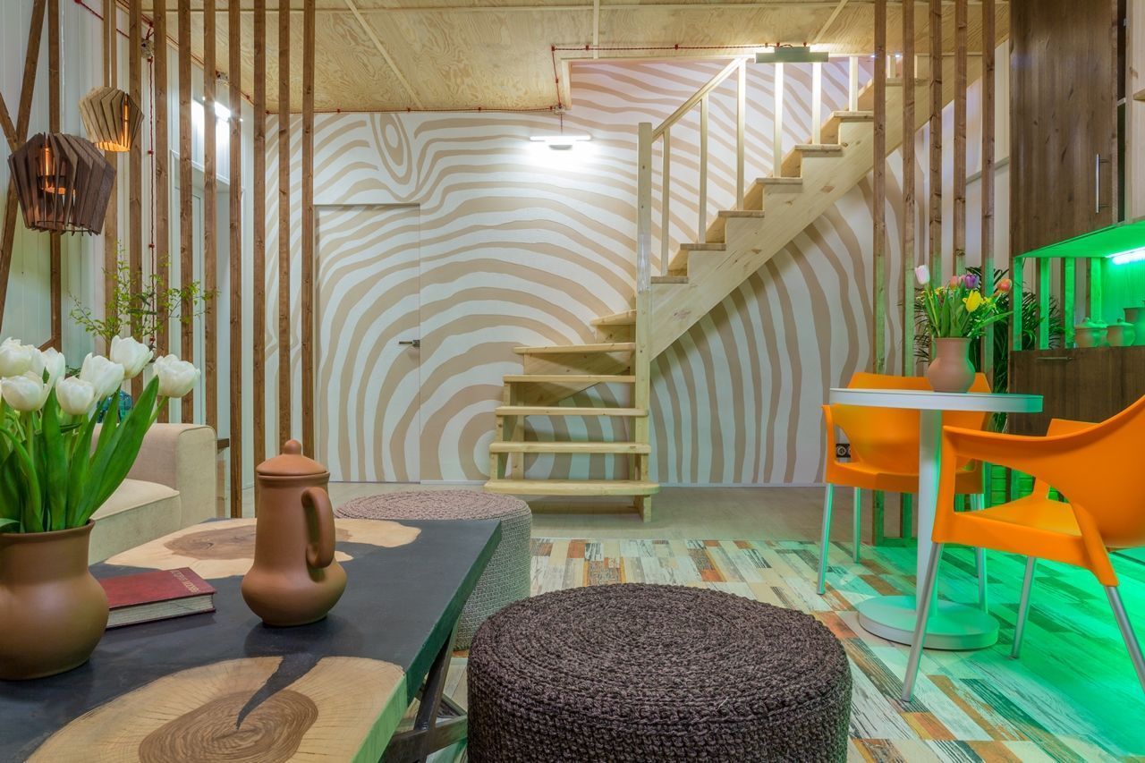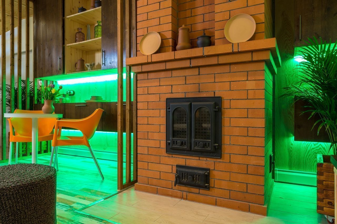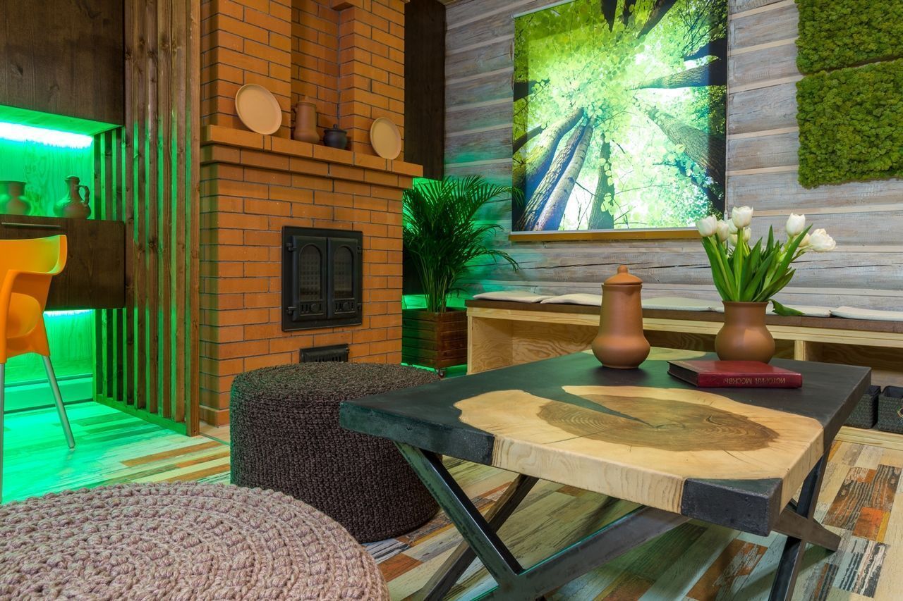 Экологичный интерьер нельзя представить без зелени – цветов и растений. Они являются неотъемлемым атрибутом нового интерьера. А дополнением к ним стала светодиодная подсветка, подчеркнувшая «зелёный» стиль гостиной. Для этого светодиодная лента Arlight зелёного цвета свечения была установлена под навесными шкафами.