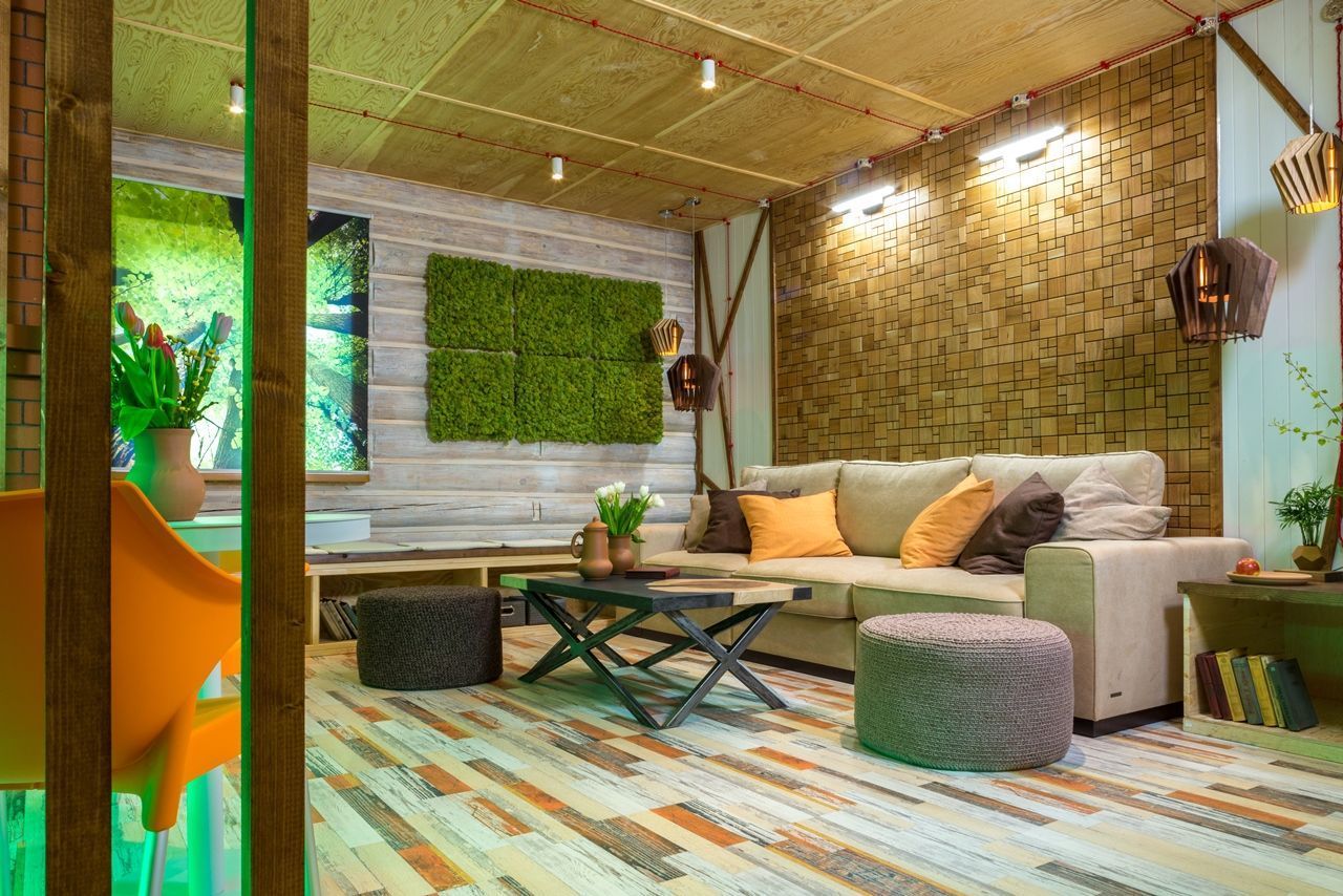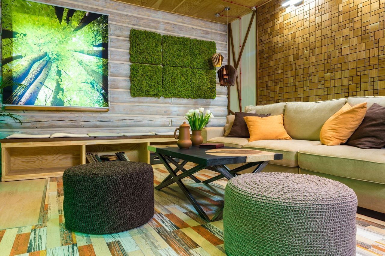 Гостиная загородного дома по пожеланию его хозяев была оформлена в «ЭКО»-стиле. Центральным элементом в гостиной стал, конечно же, натуральный материал – дерево. В оформлении интерьера также были применены и другие экологически безвредные материалы.