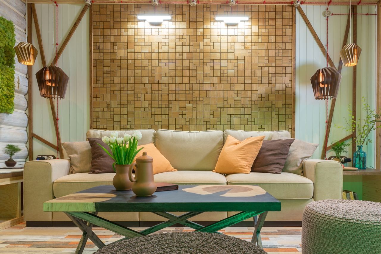Светодиодная подсветка подчеркнула экологичный стиль гостиной в загородном доме, ремонт которой был выполнен в проекте «Фазенда» на Первом канале.