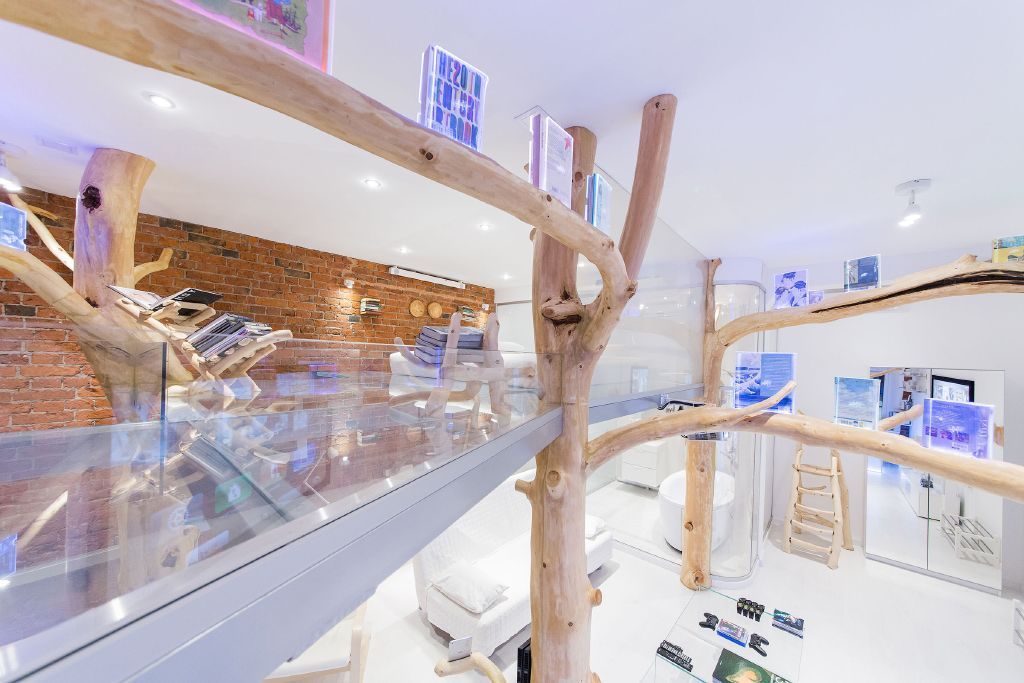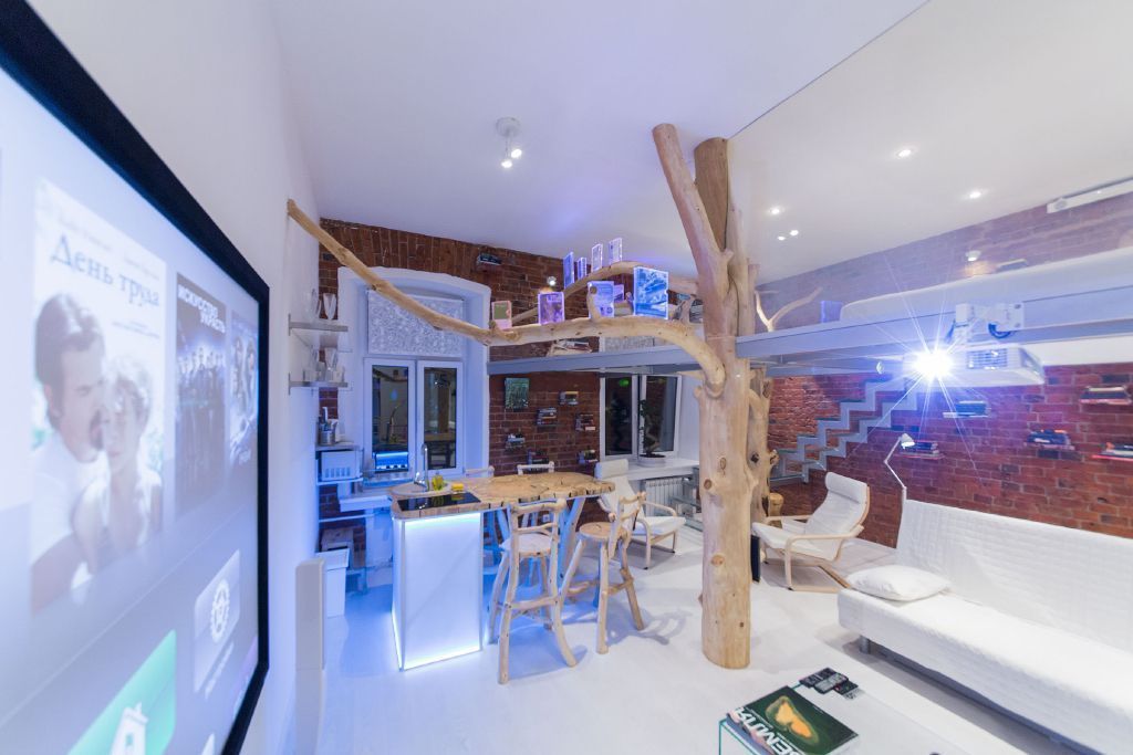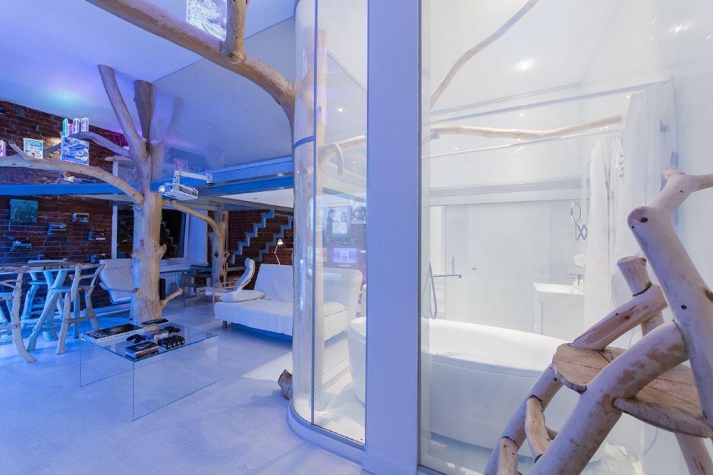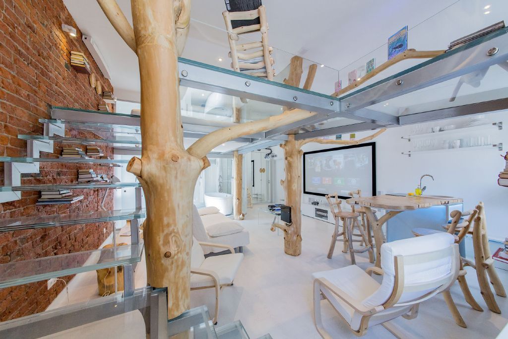 Интерьер данной квартиры-студии привлекает необычным сочетанием современных материалов - стекла и металла, строгих геометрических форм, что характерно для стиля хай-тек, и натурального материала - дерева. Из дерева здесь сделаны не только элементы мебели - обеденная стойка, стулья и кресла, стволы и ветви деревьев буквально окутывают студию. Интереснейший приём - стальные опоры второго уровня студии заключены в стволы деревьев, благодаря чему может возникнуть ощущение своеобразного "домика на дереве".