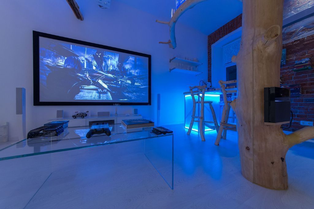 Второй уровень квартиры-студии был выделен для спальной зоны, её отделили от основного пространства необычным стеклом, способным изменять степень прозрачности. Оно было оснащено дополнительной светодиодной подсветкой на основе многоцветной светодиодной ленты arlight®. Мультицветная RGB светодиодная лента arlight® также используется в подсветке основания стола-стойки обеденный зоны студии.