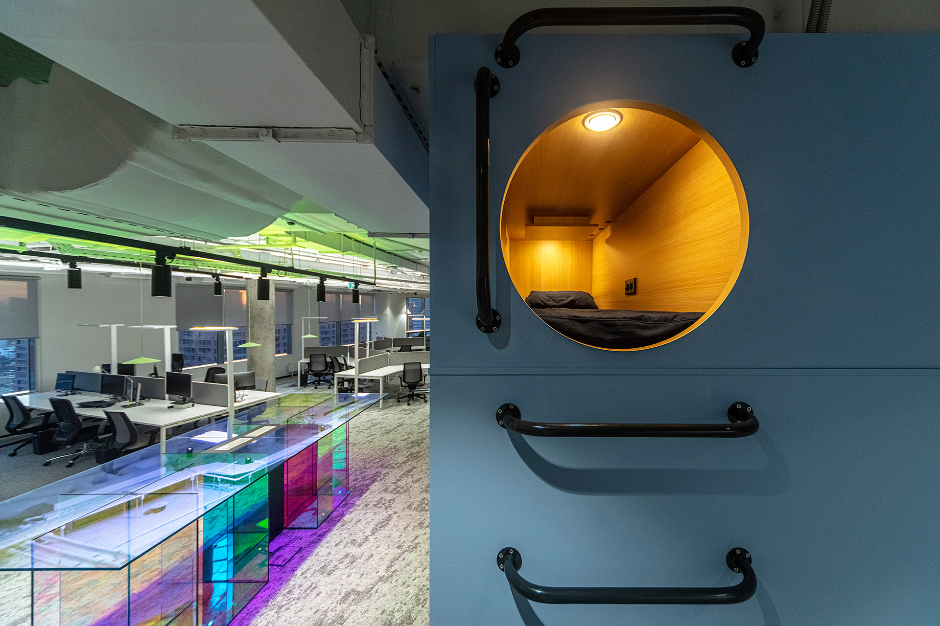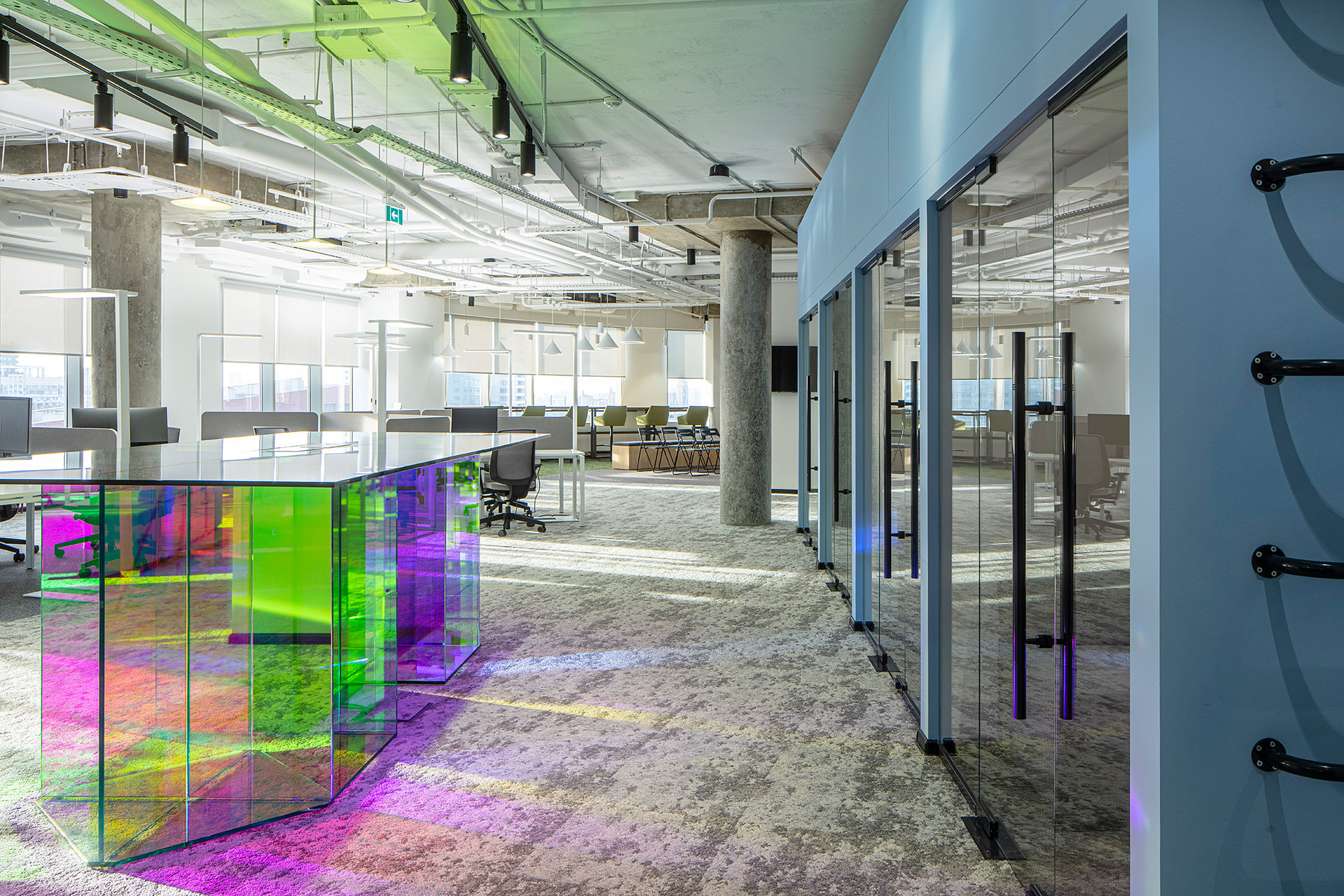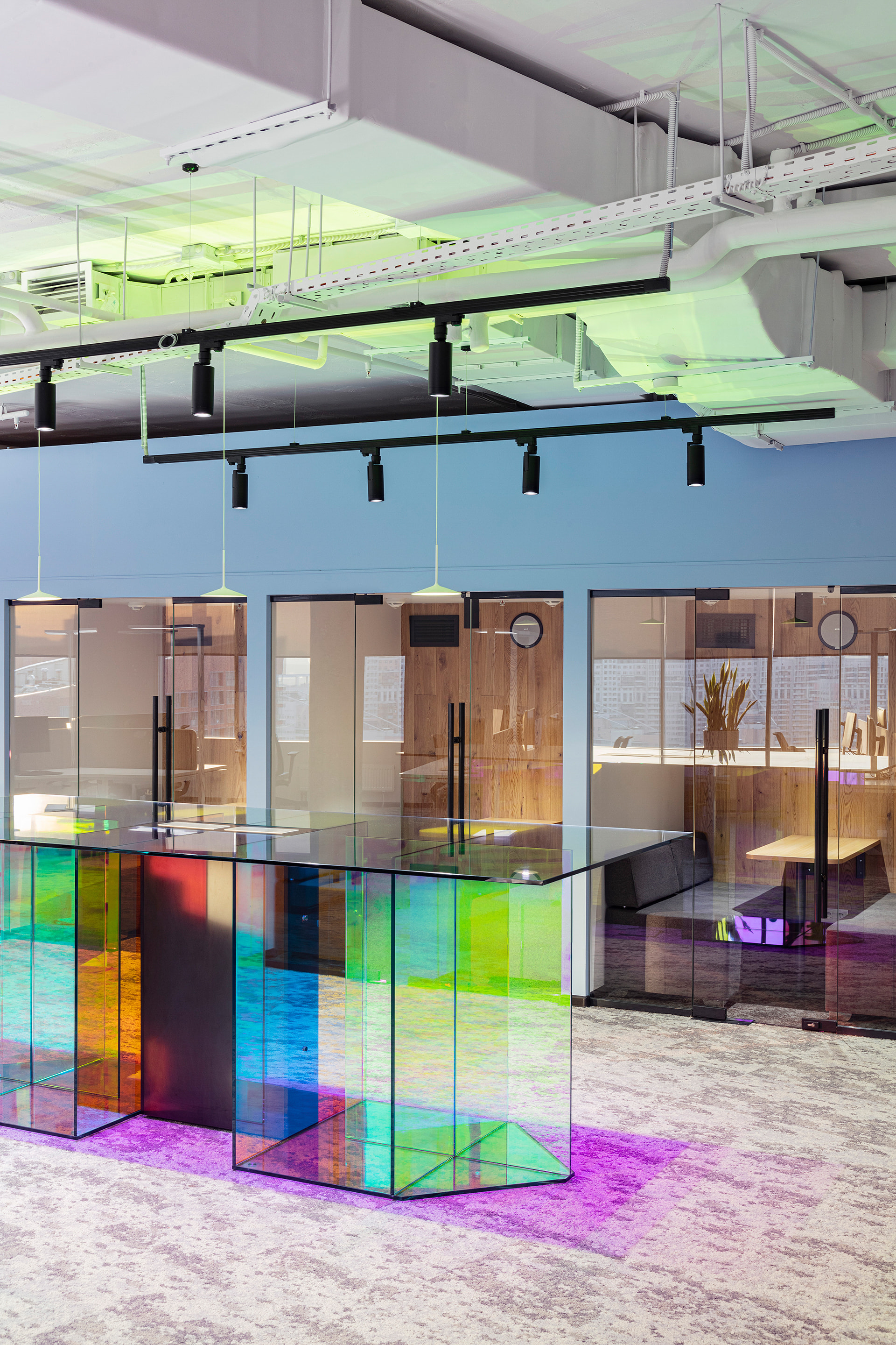 Основой концепции проекта стало стремление приблизиться к природе через форму и цвет. Сдержанные натуральные оттенки в оформлении, интерьер в стиле хай-тек без лишних деталей: максимум простоты, пространства и естественного света. В качестве искусственных источников света были выбраны стильные и лаконичные трековые светильники серии ZEUS с высоким индексом цветопередачи CRI>90. Светильники простой формы черного цвета идеально смотрятся в любой зоне офиса и обеспечивают качественное акцентное освещение. Свободное перемещение светильников вдоль трека позволяет создать комфортную световую среду в любой части коворкинга.