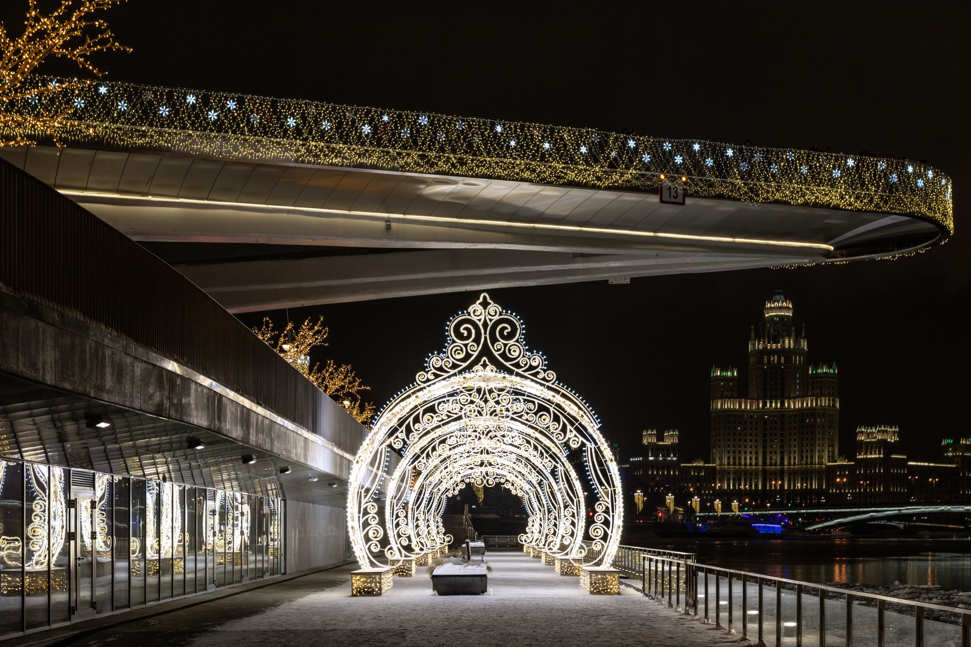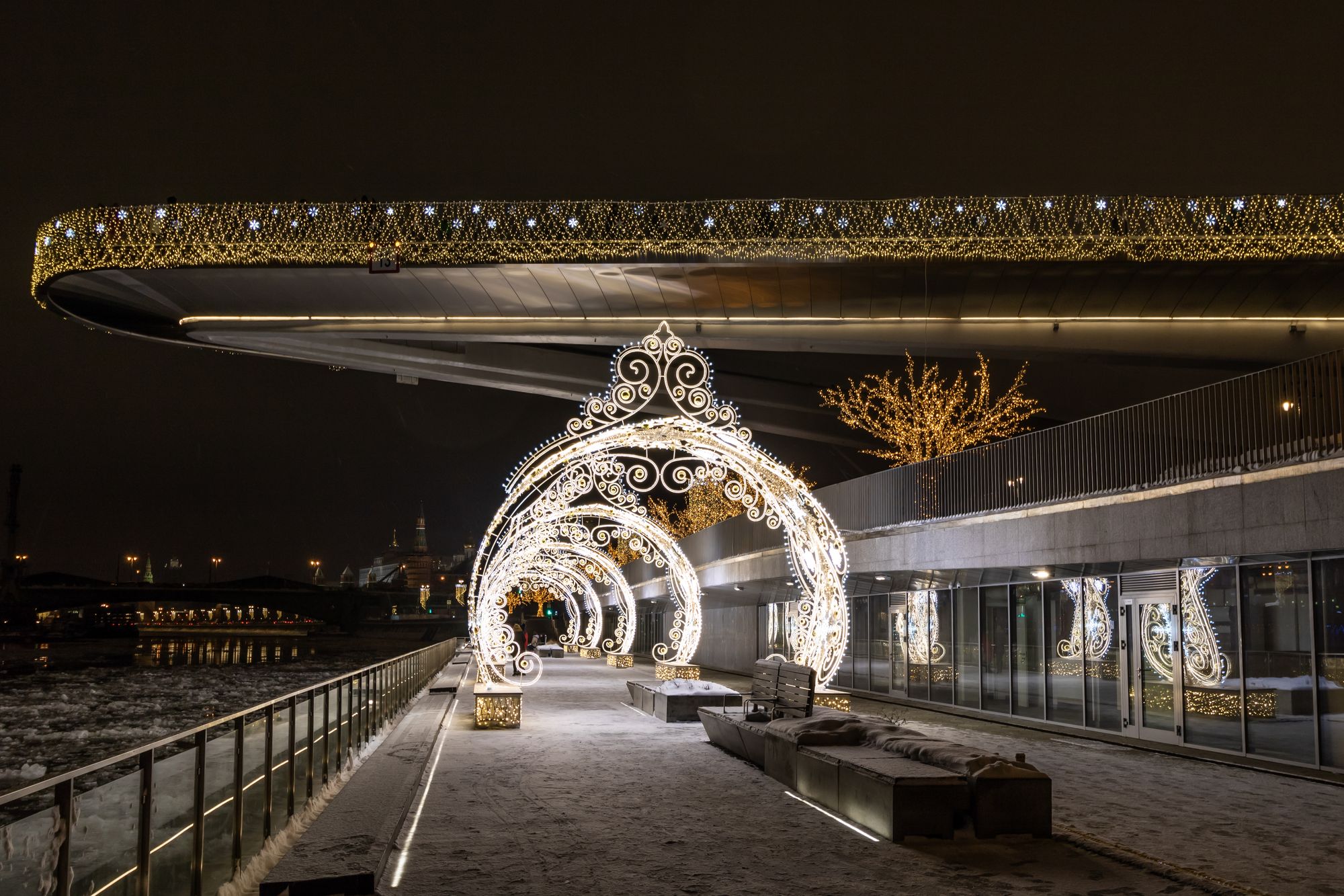 По всему периметру «парящего» моста организована светодиодная подсветка с использованием профилей и герметичных светодиодных лент. Эффектное и яркое декоративное освещение в сочетании с необычным архитектурным обликом моста становится центром притяжения гостей парка «Зарядье». В проекте использованы анодированные алюминиевые профили, устойчивые к неблагоприятным внешним воздействиям и коррозии. Светодиодные ленты с высокой степенью пылевлагозащиты обеспечивают надежную эксплуатацию при любых погодных условиях. Матовые рассеиватели помогают создать равномерное свечение, приятное для глаз.