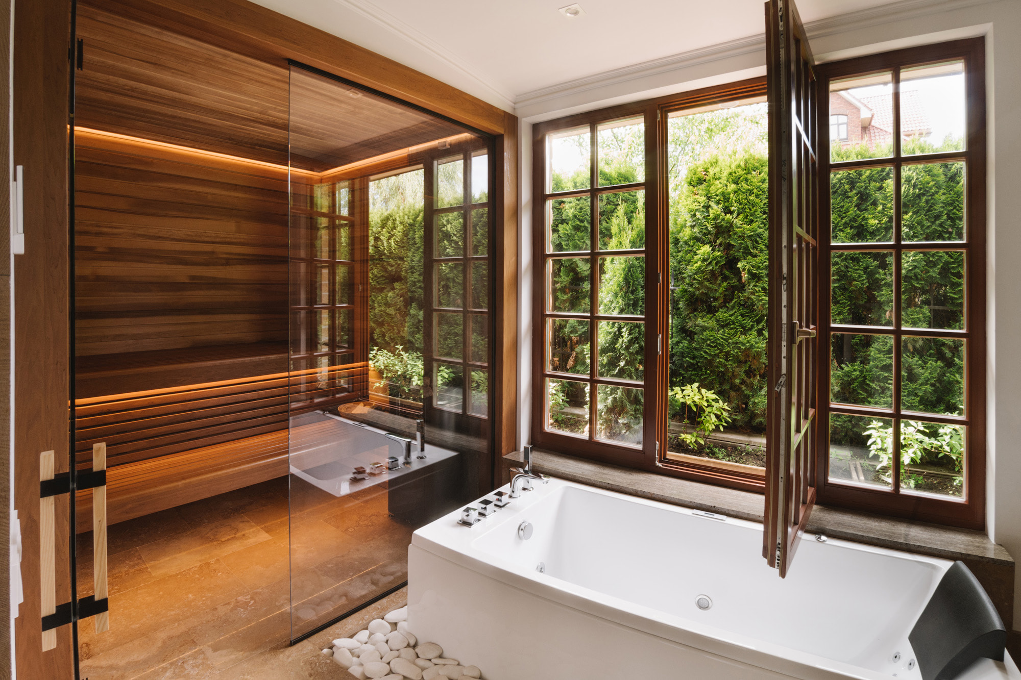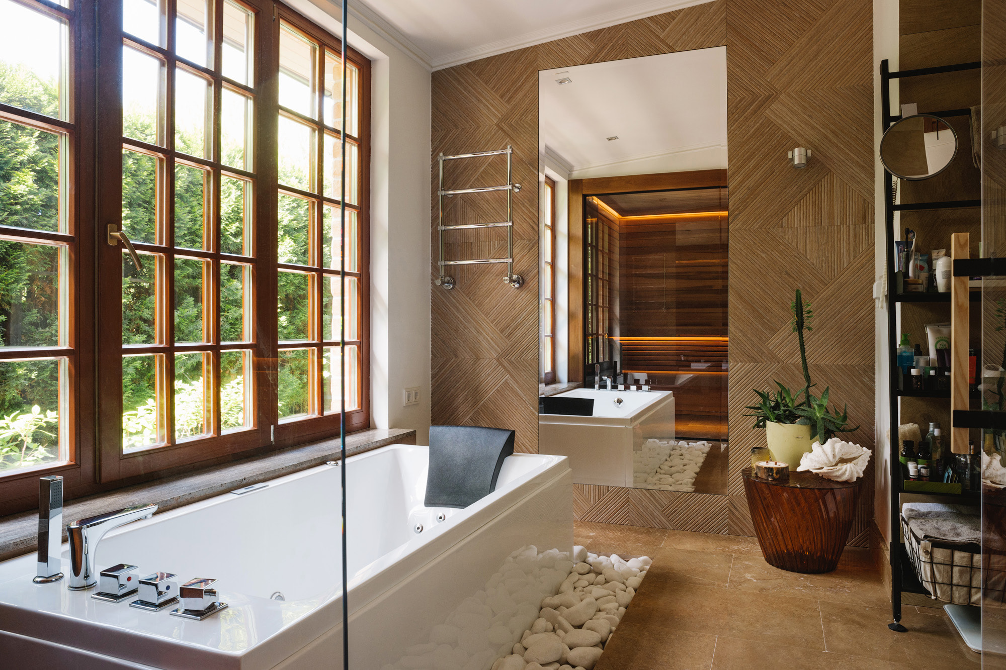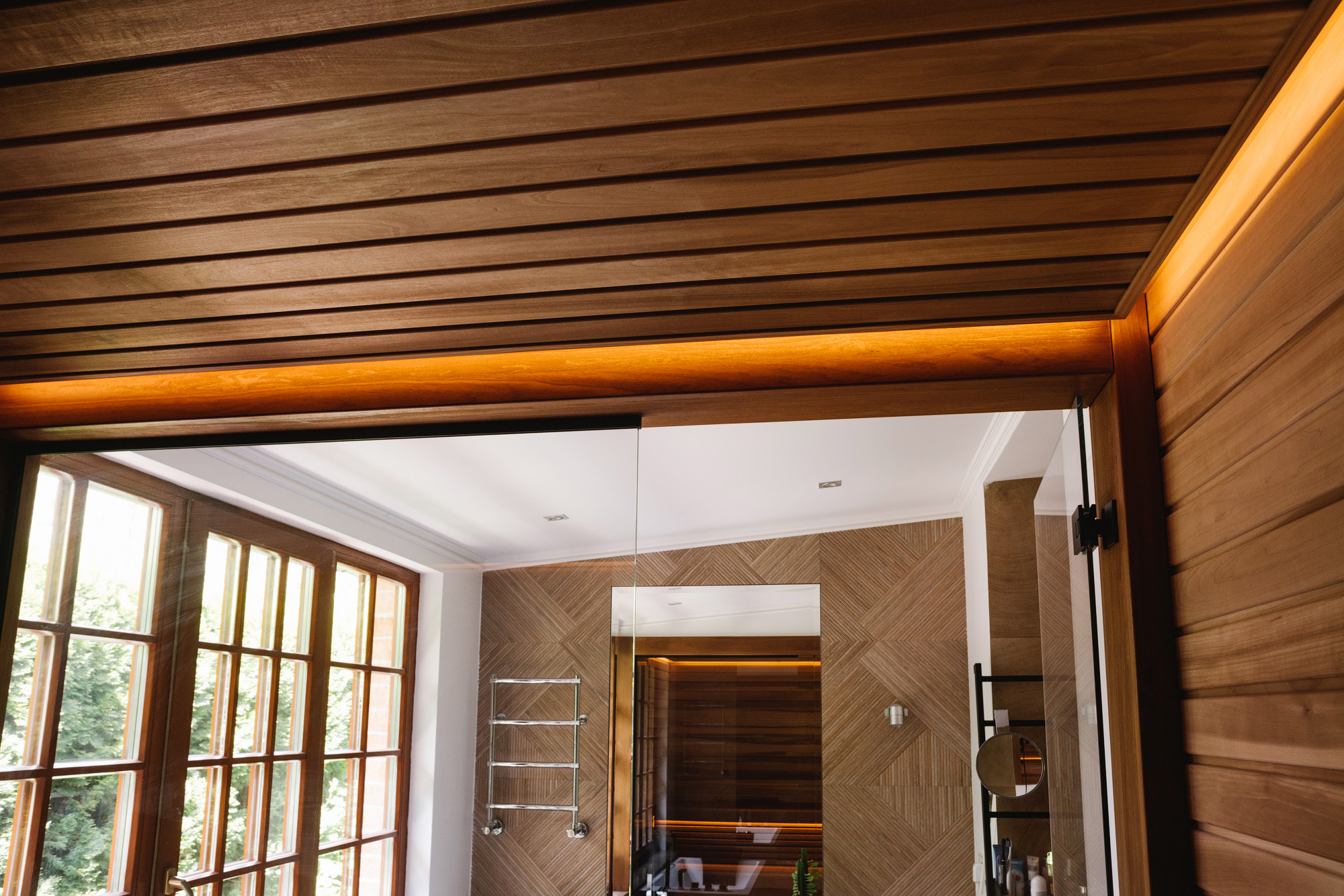Уютная сауна отделена от ванной комнаты прозрачной стеклянной перегородкой, что визуально делает компактное пространство шире. Полки и отделка стен внутри парной выполнены из термоосины, которая отталкивает влагу и обладает низкой теплопроводностью.