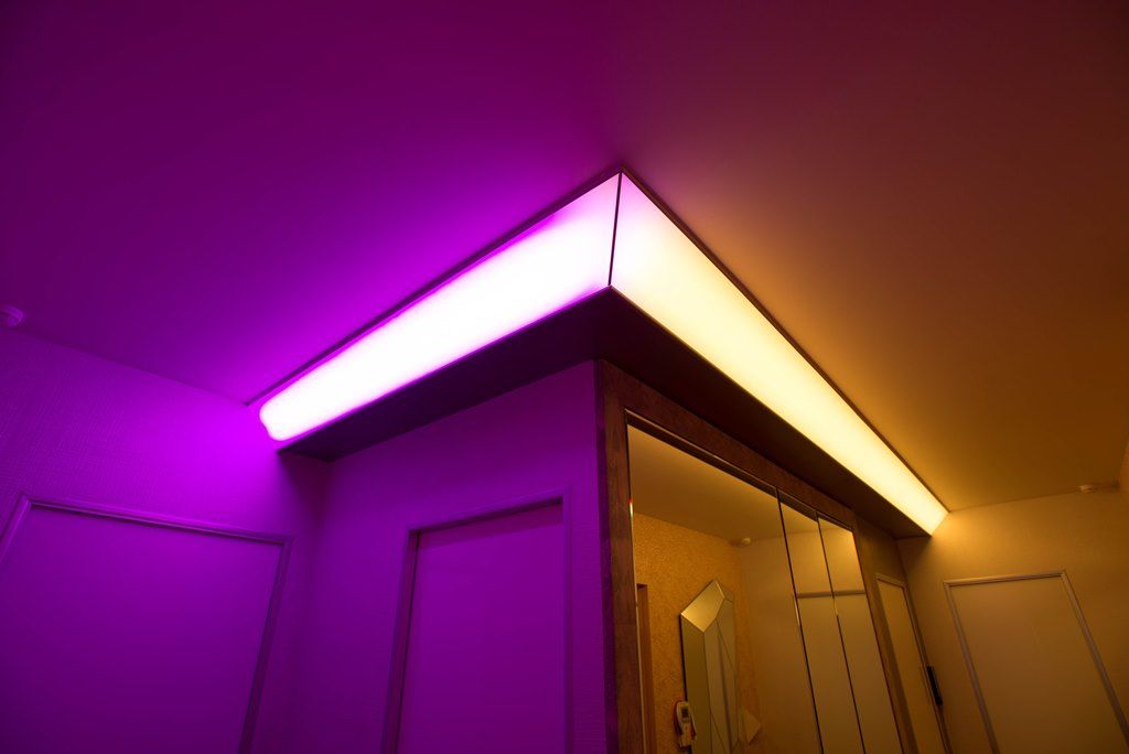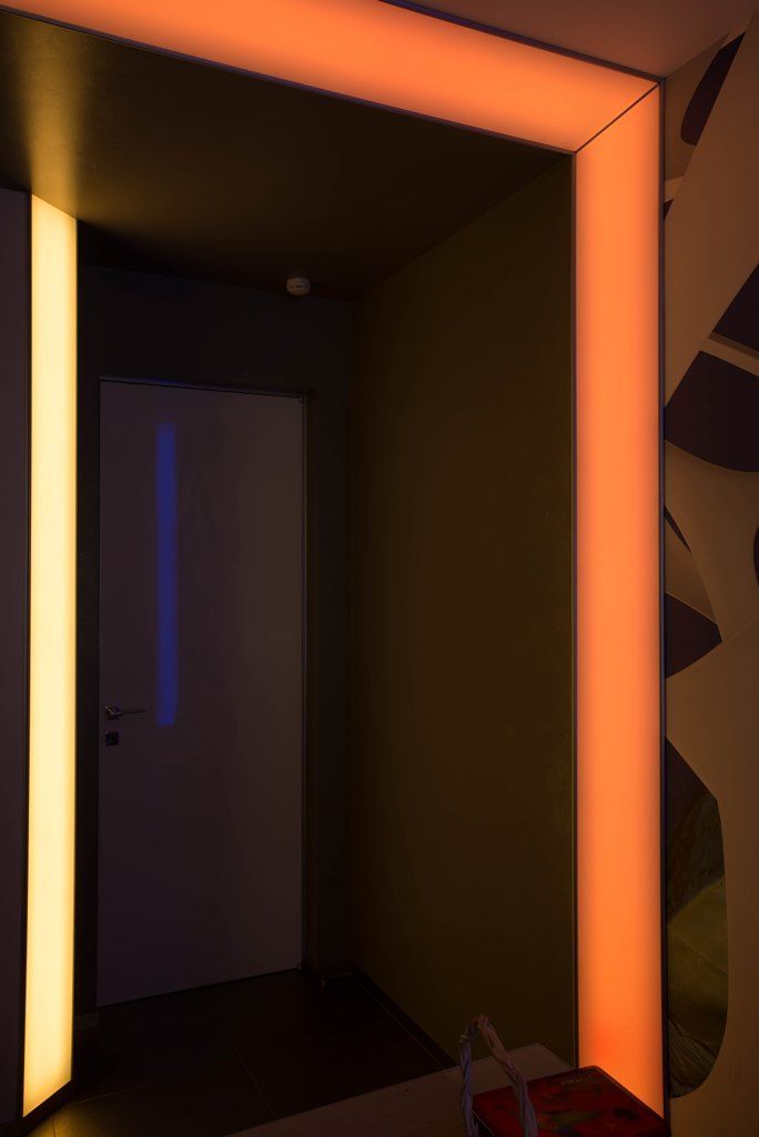 В прихожей освещение также строится на мягкой подсветке скрытой за матовыми пластиковыми панелями. Особенно интересно там смотрится смена цветов RGB-ленты arlight®, многократно отражающаяся в мозаике из зеркал.