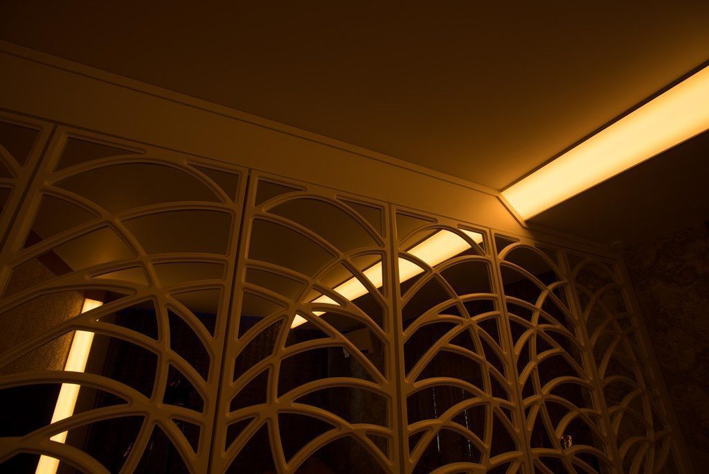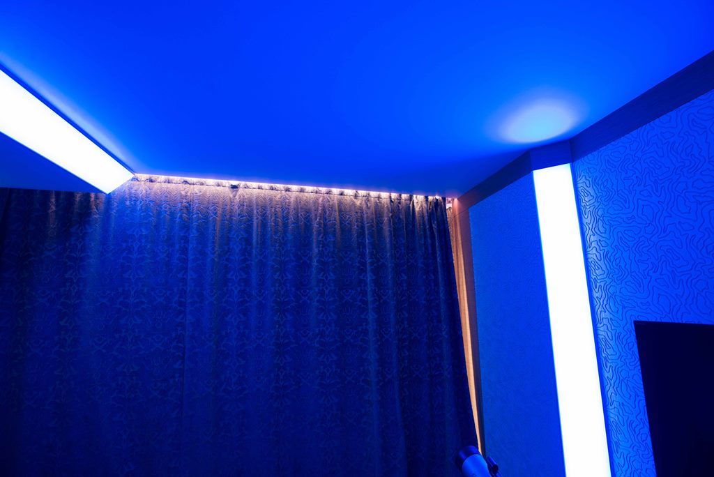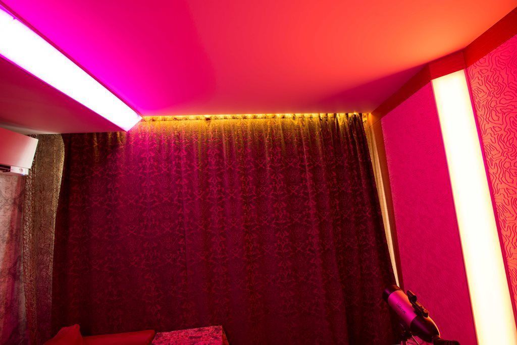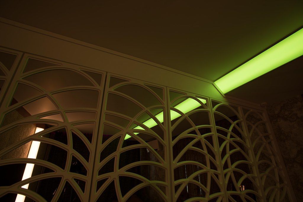 Но основное освещение в комнате не ограничивается широкой световой полосой. Одна из стен, где расположено окно, также украшена тонкими полосками с многоцветными светодиодными лентами arlight®, которые закреплены с помощью врезного алюминиевого профиля arlight® и полностью сливаются с плоскостью стены (если я всё правильно поняла). Свет от них не так бросается в глаза, но является приятной изюминкой интерьера. Отражающееся во множестве зеркал лёгкое мерцание создаёт в комнате удивительную атмосферу. Сочетание яркого света основного освещения и лёгкого мерцания декоративной подсветки