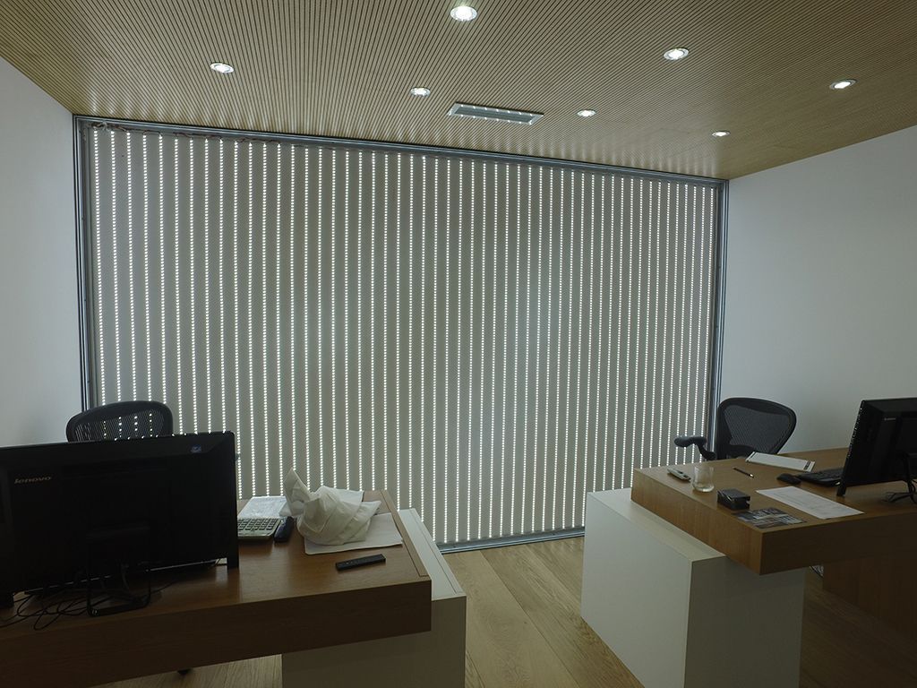 Вторая задача - сплошная засветка светопропускающего полотна. Для этого специалисты рассчитали оптимальное расстояние между светодиодными лентами, разметили места монтажа, подготовили поверхность и установили ленту. Всю светодиодную ленту подключили к диммеру и усилителям, чтобы иметь возможность регулировать яркость освещения. После завершения монтажа ленты и проверки системы, поверх было натянуто светопропускающее полотно, которое создало эффект полностью и равномерно светящейся стены.