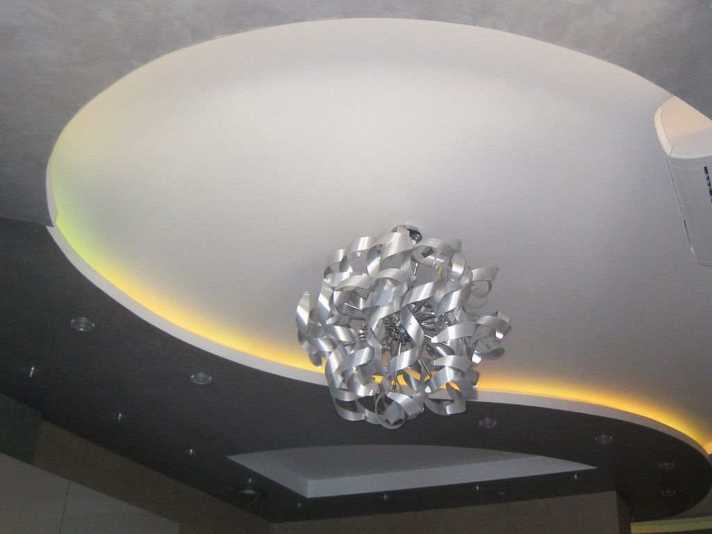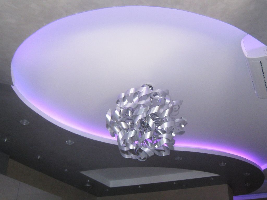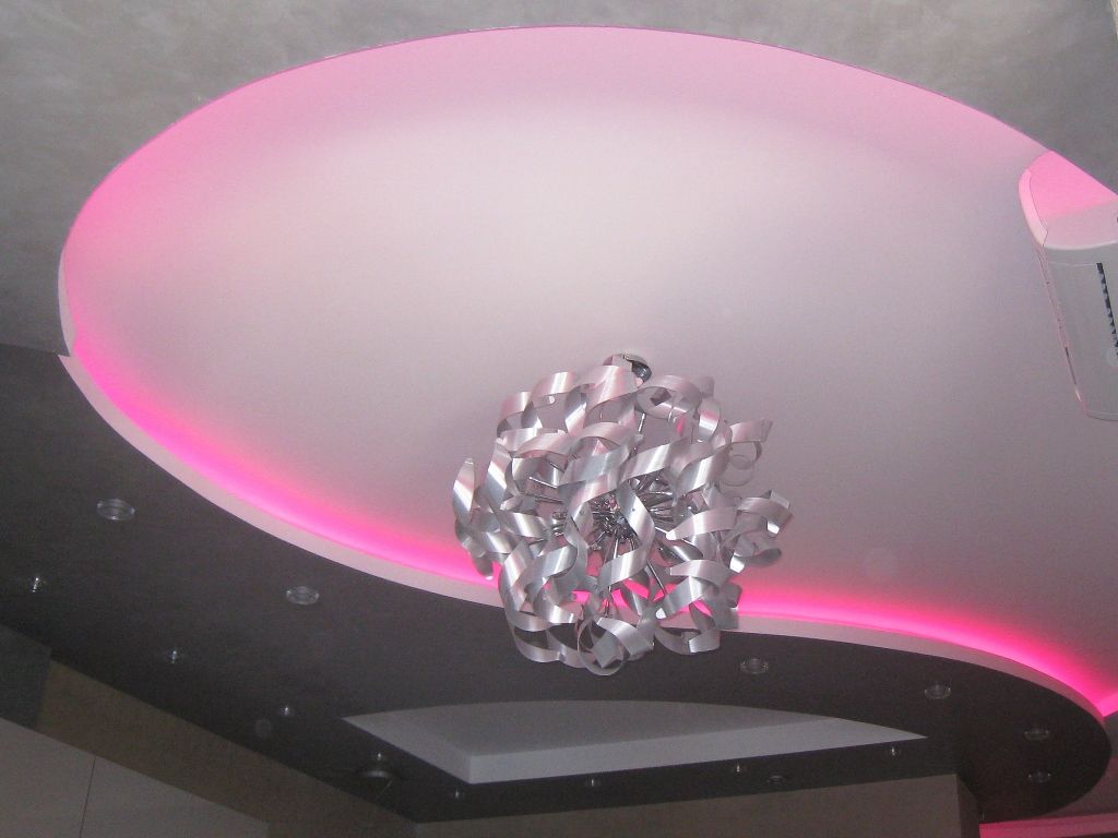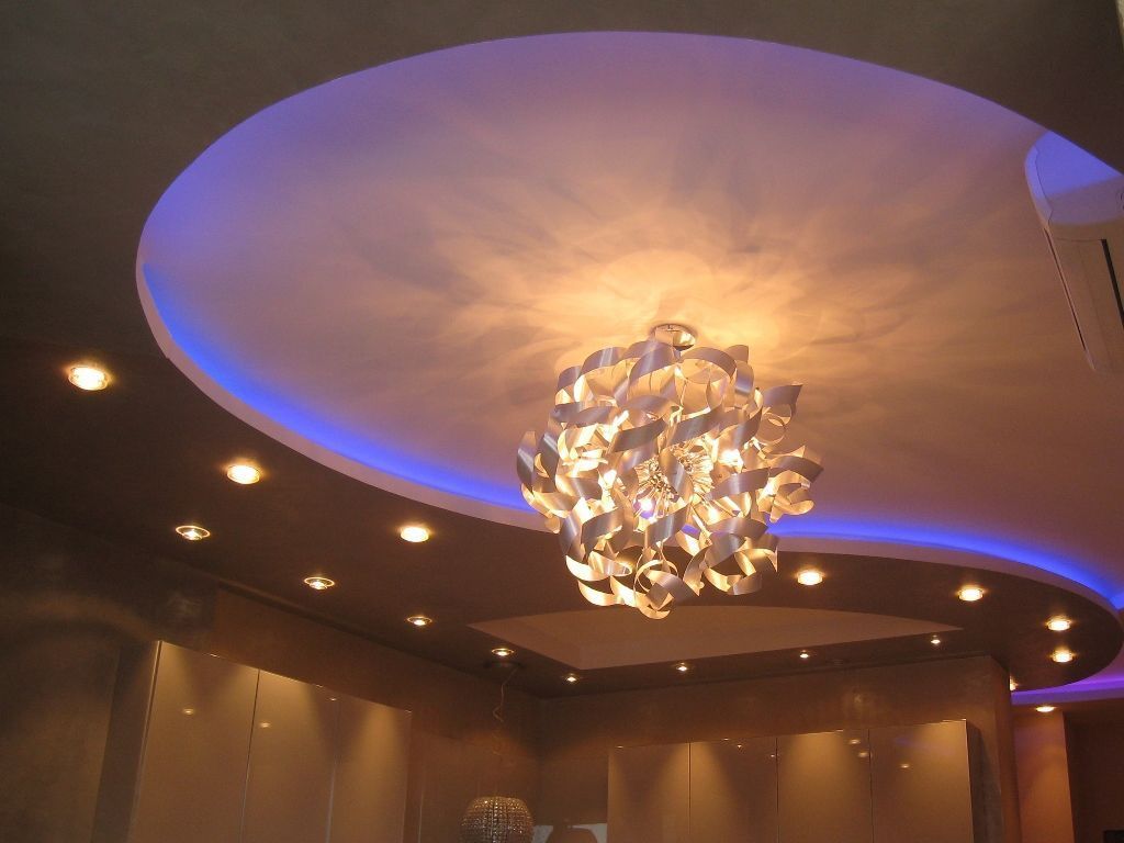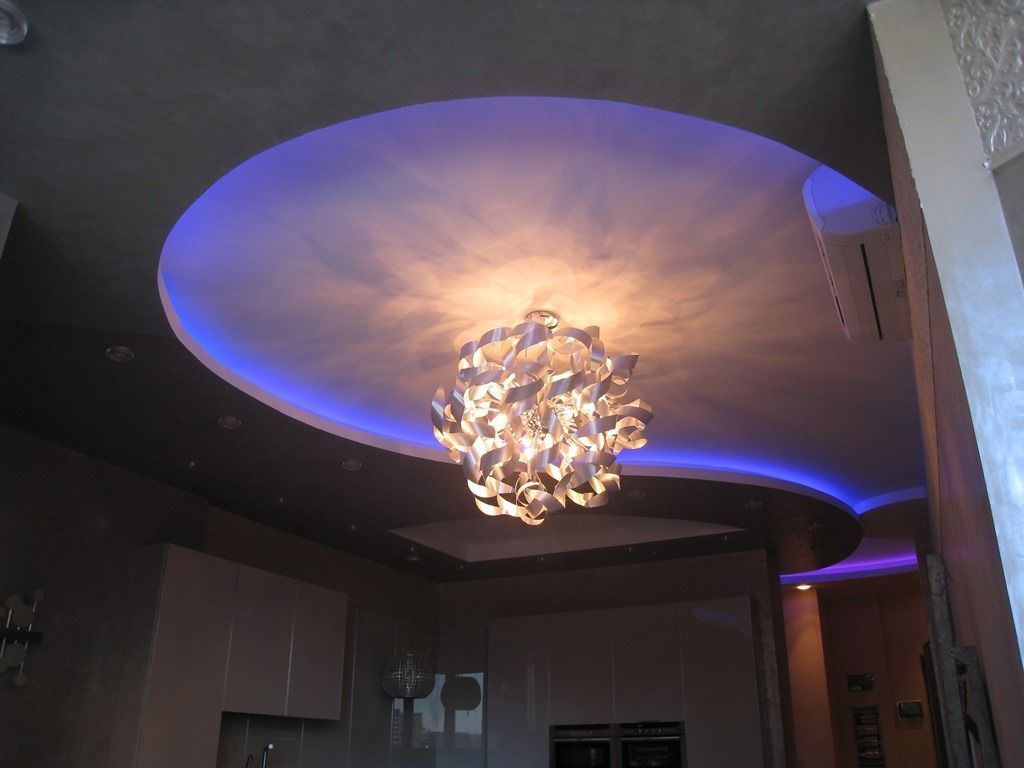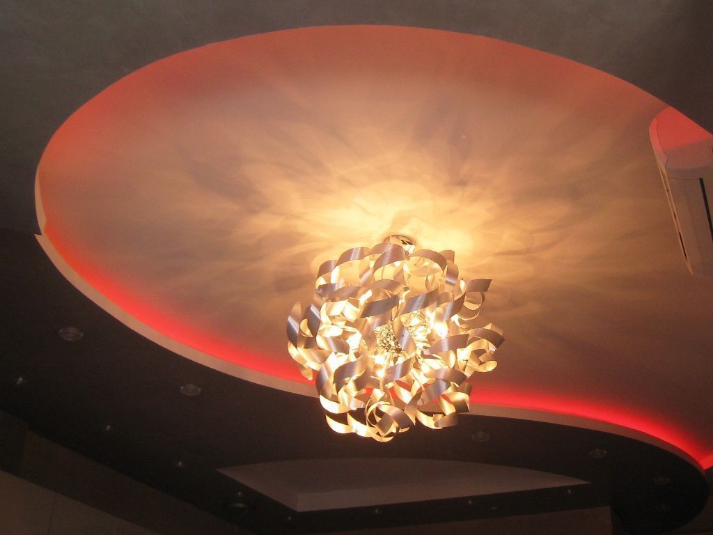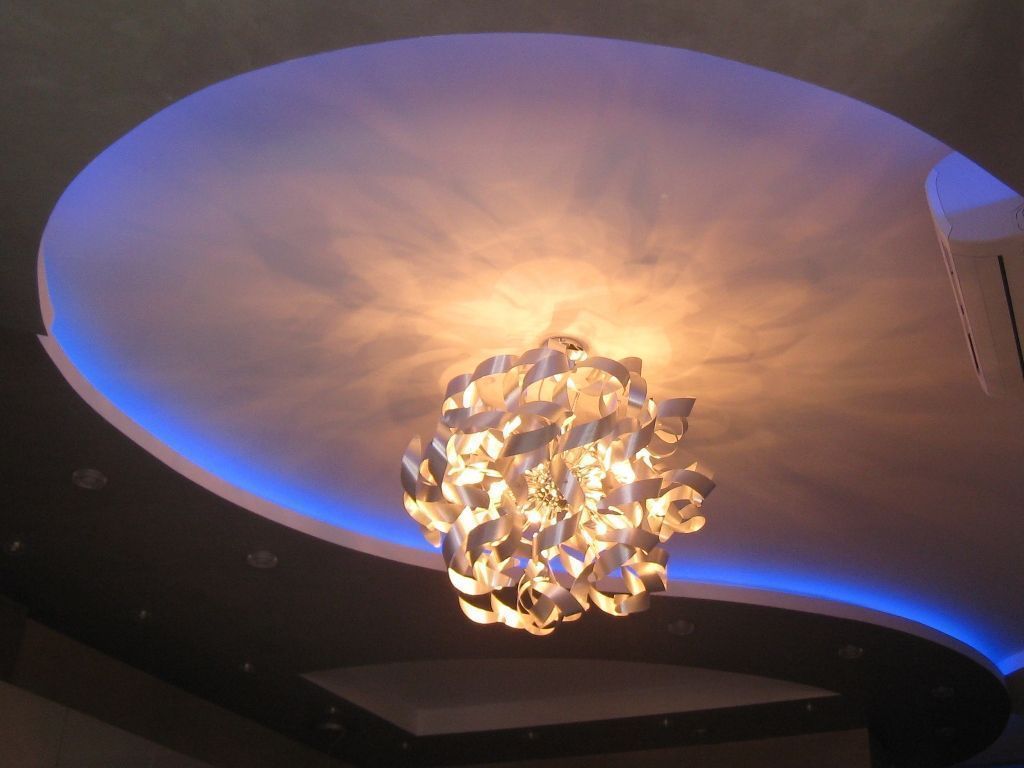 Сочетание люстры, точечных светильников и цветной светодиодной ленты arlight® в зале.